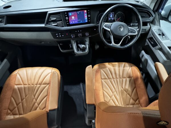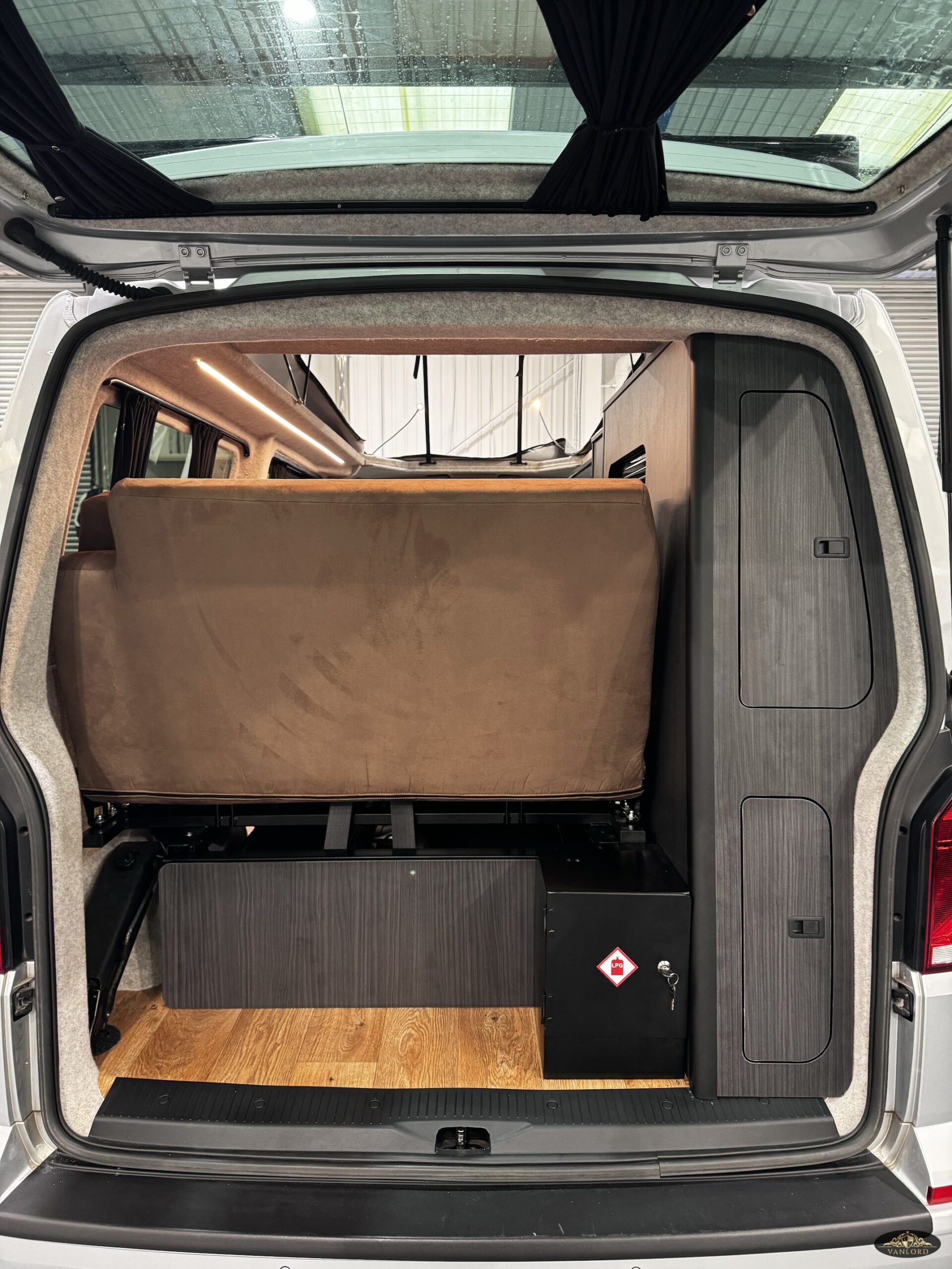 Our usual high-end conversion comes loaded with a front M1 Crash Tested passenger swivel base, RIB Altair Slider bed with integrated ISOFIX points trimmed in brown leatherette and checkered Alcantara middles and two full size drawers, 50L fridge-freezer, double gas cooker, Autoterm diesel heater, bespoke 12V electrical installation with integrated wireless charging pad much more.