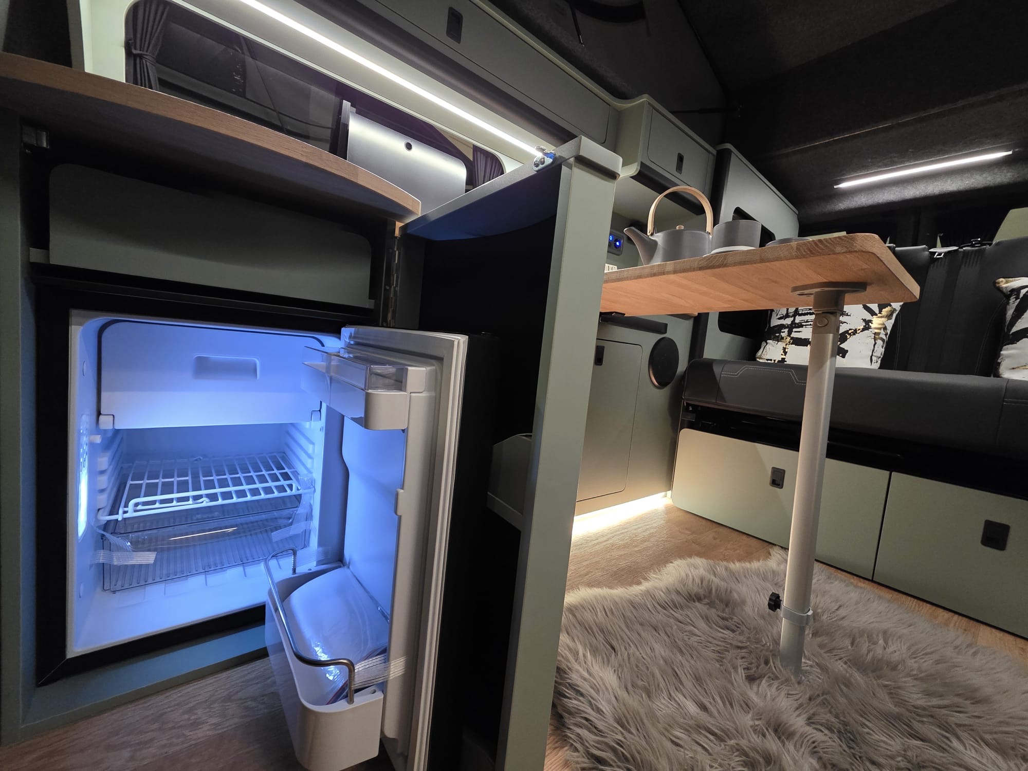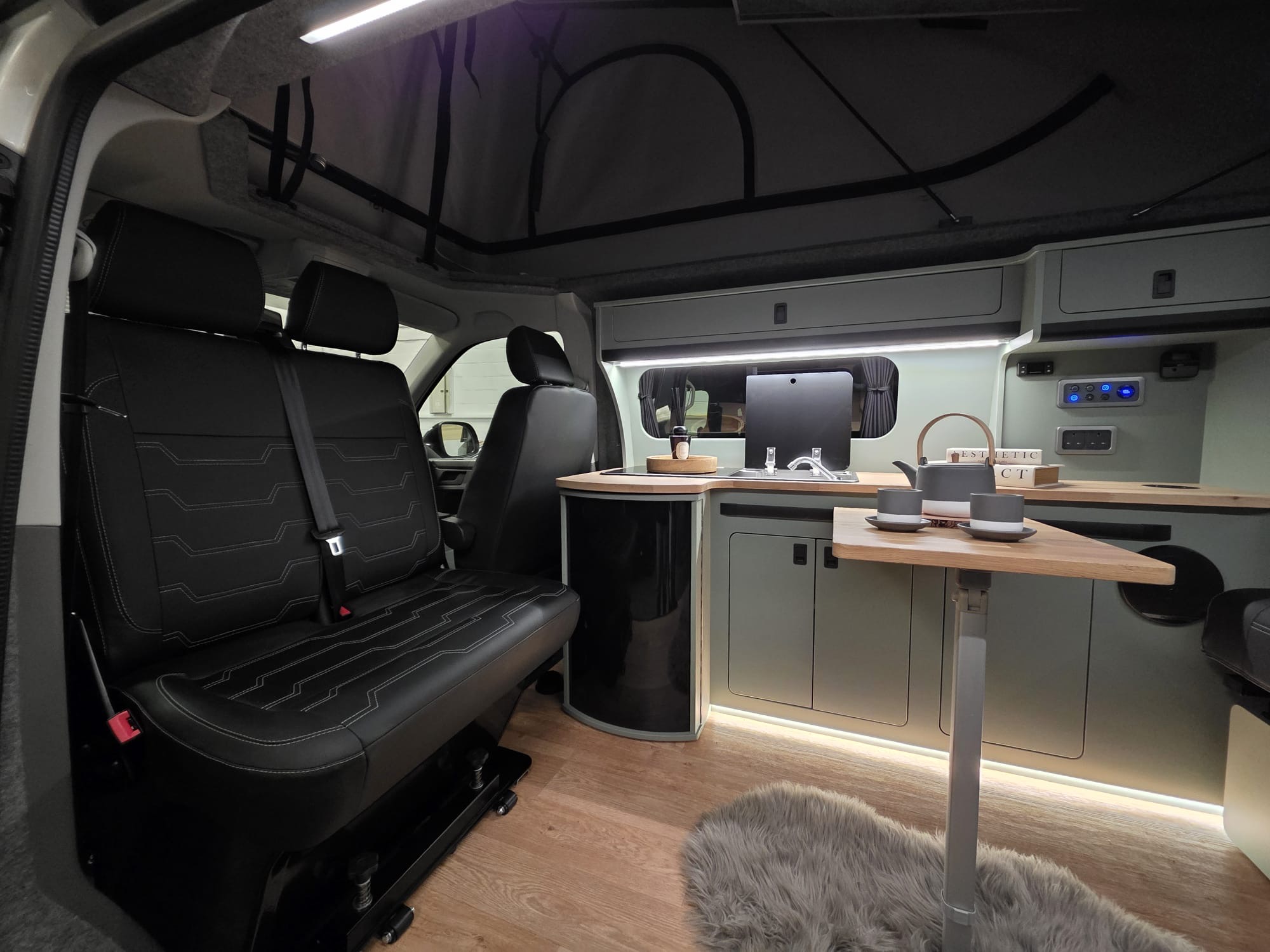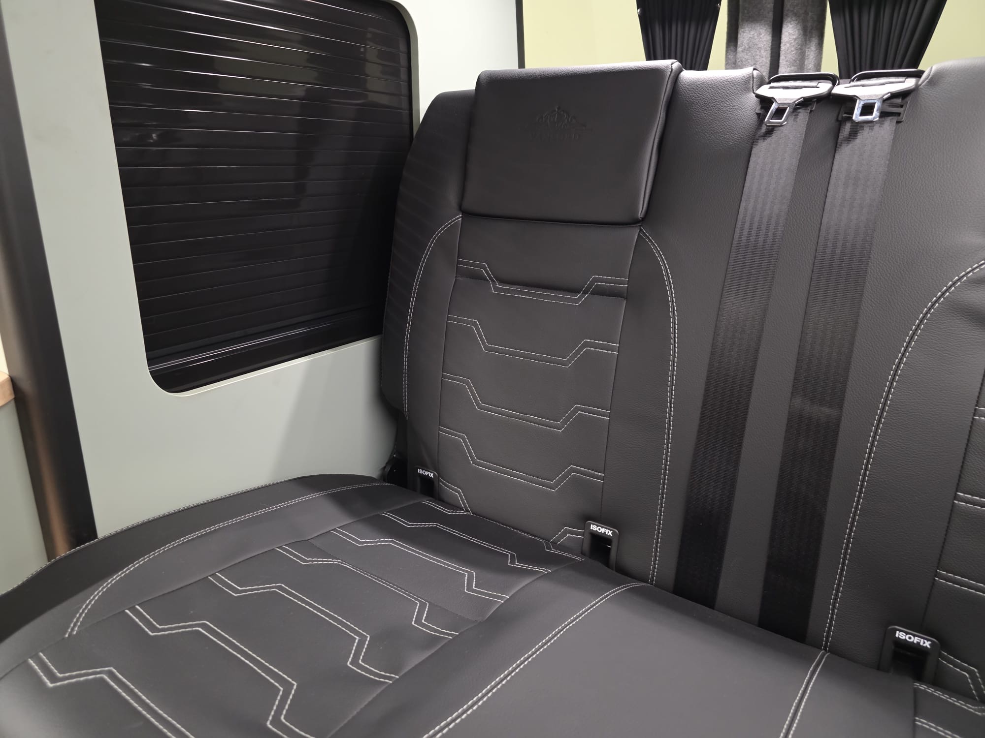 Our usual high-end conversion comes loaded with a front M1 Crash Tested passenger swivel base, RIB Altair 112cm Slider bed trimmed in Black leatherette with two integrated ISOFIX points and two full size drawers, 50L fridge-freezer, double gas cooker, Eberspacher diesel heater, bespoke 12V electrical installation with integrated wireless charging pad much more.