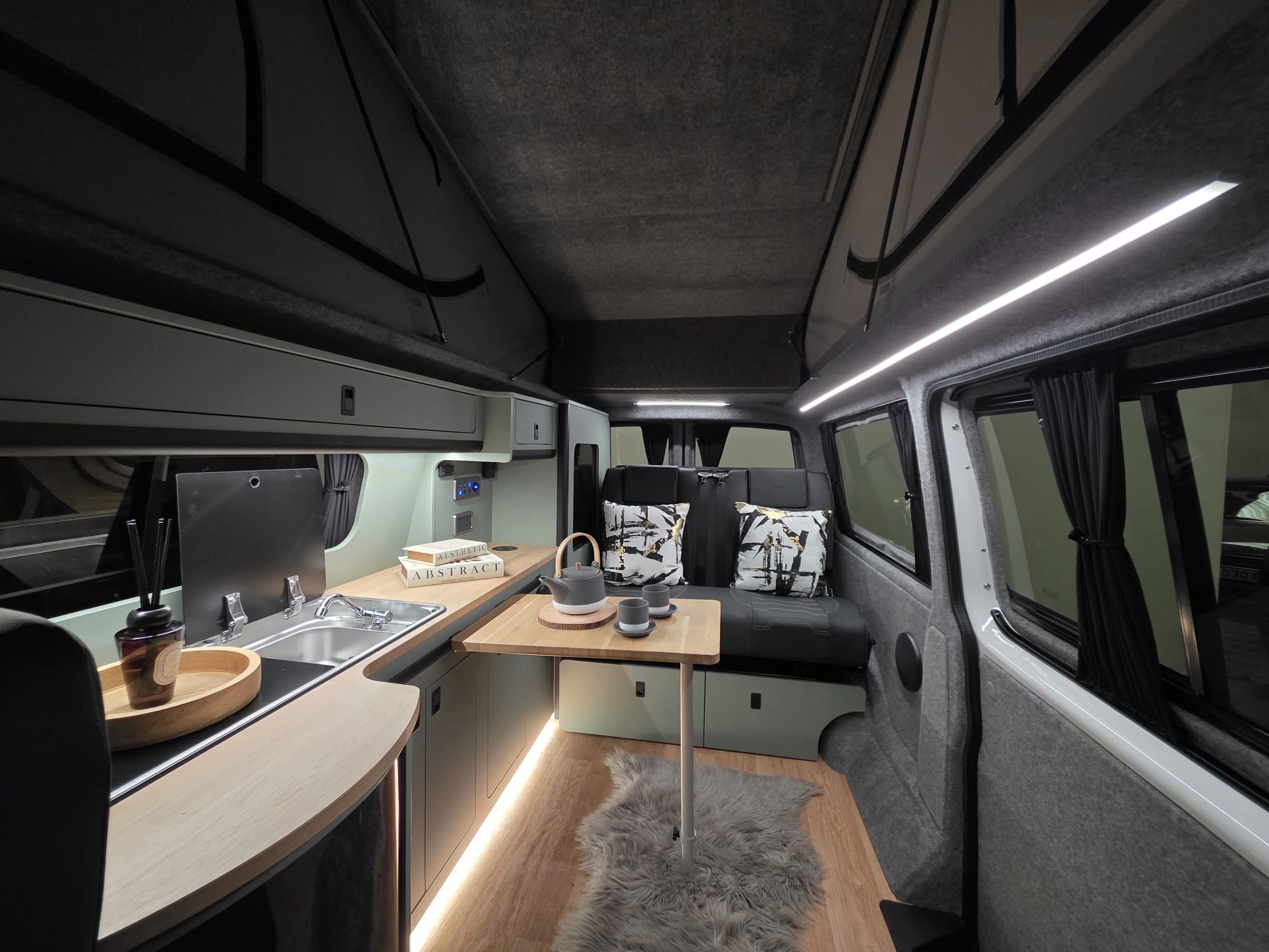 The exterior features colour coded front and rear bumpers with gloss black lip, gloss black lower and badged front grilles, gloss black trapezoid side bars, gloss black barn door spoiler. Lower half has been sprayed in Olive Green colour which is a complete match to the kitchen unit. The van is lowered by 40mm and sits on load rated 20″ Calibre Gloss Black wheels and new tyres. Up top it has a Skyline elevating roof with a scenic canvas and a 200W solar panel.