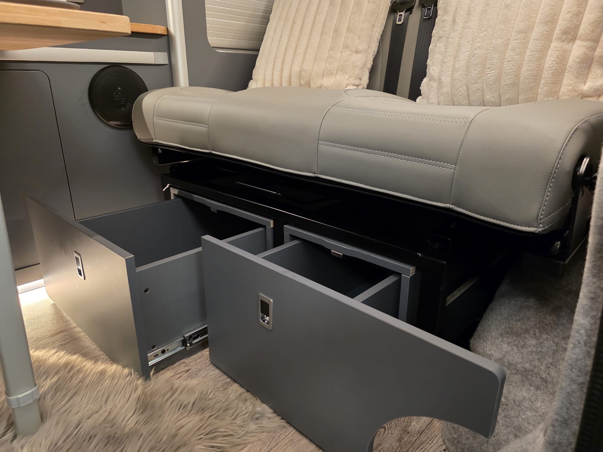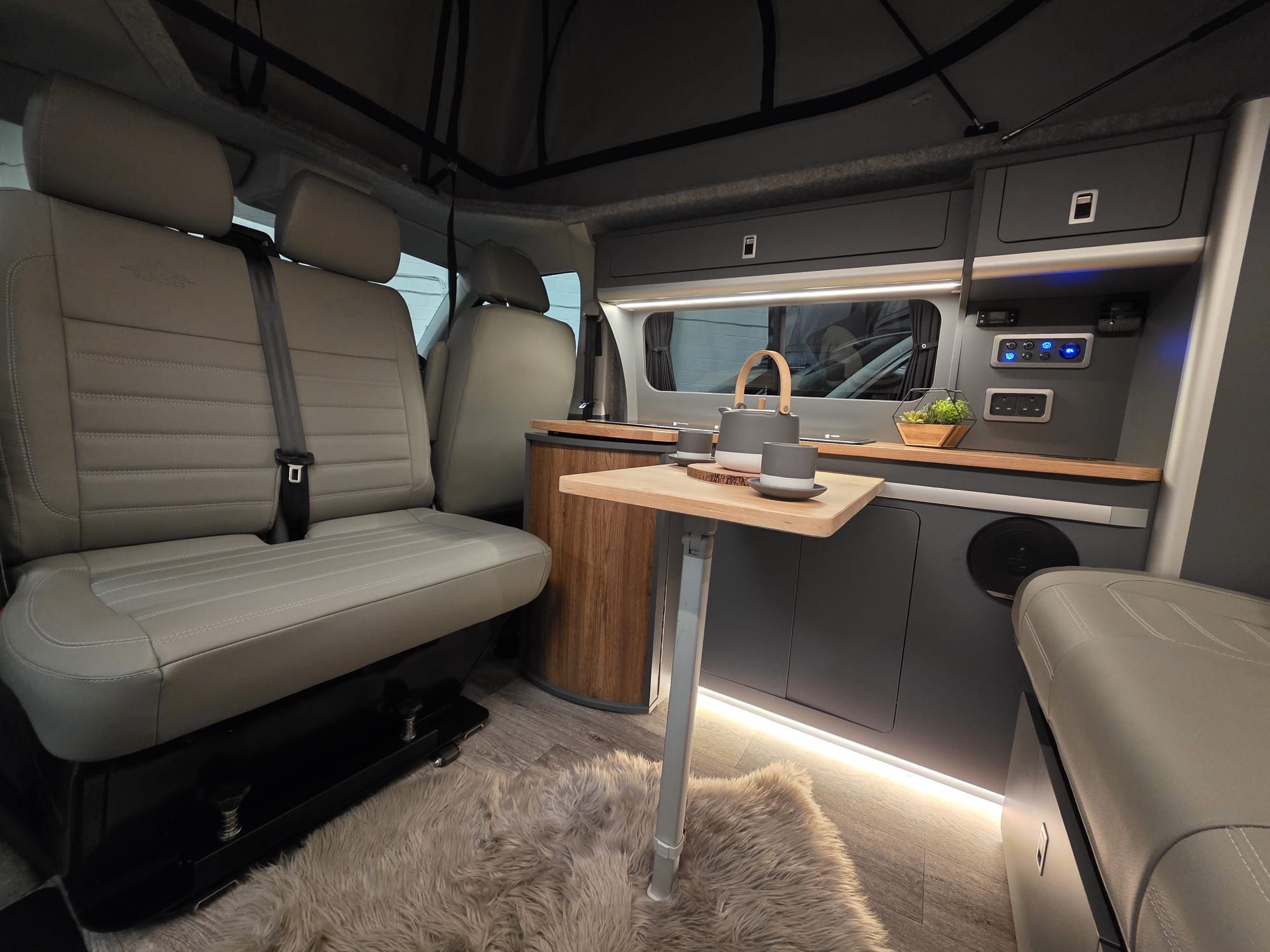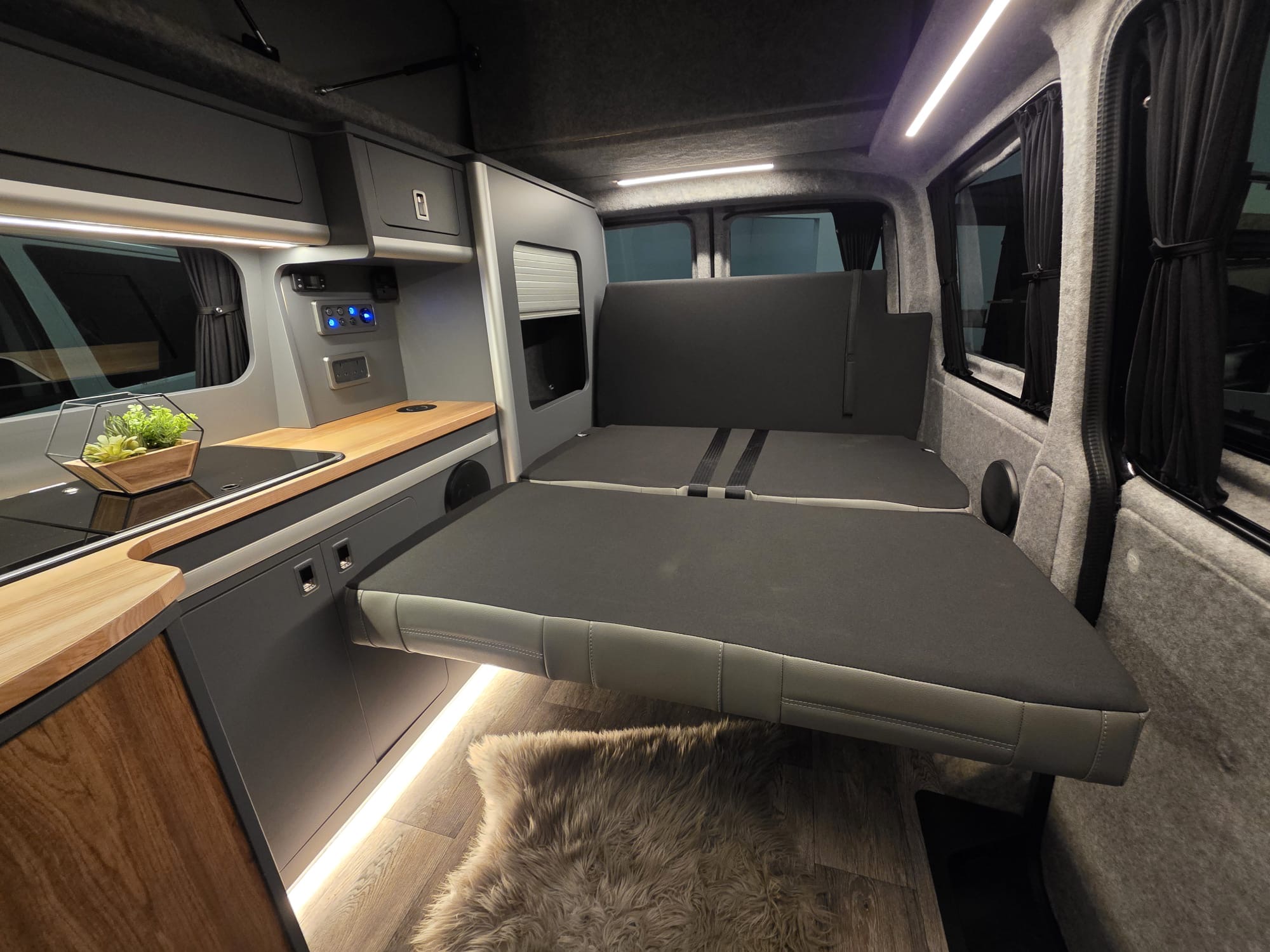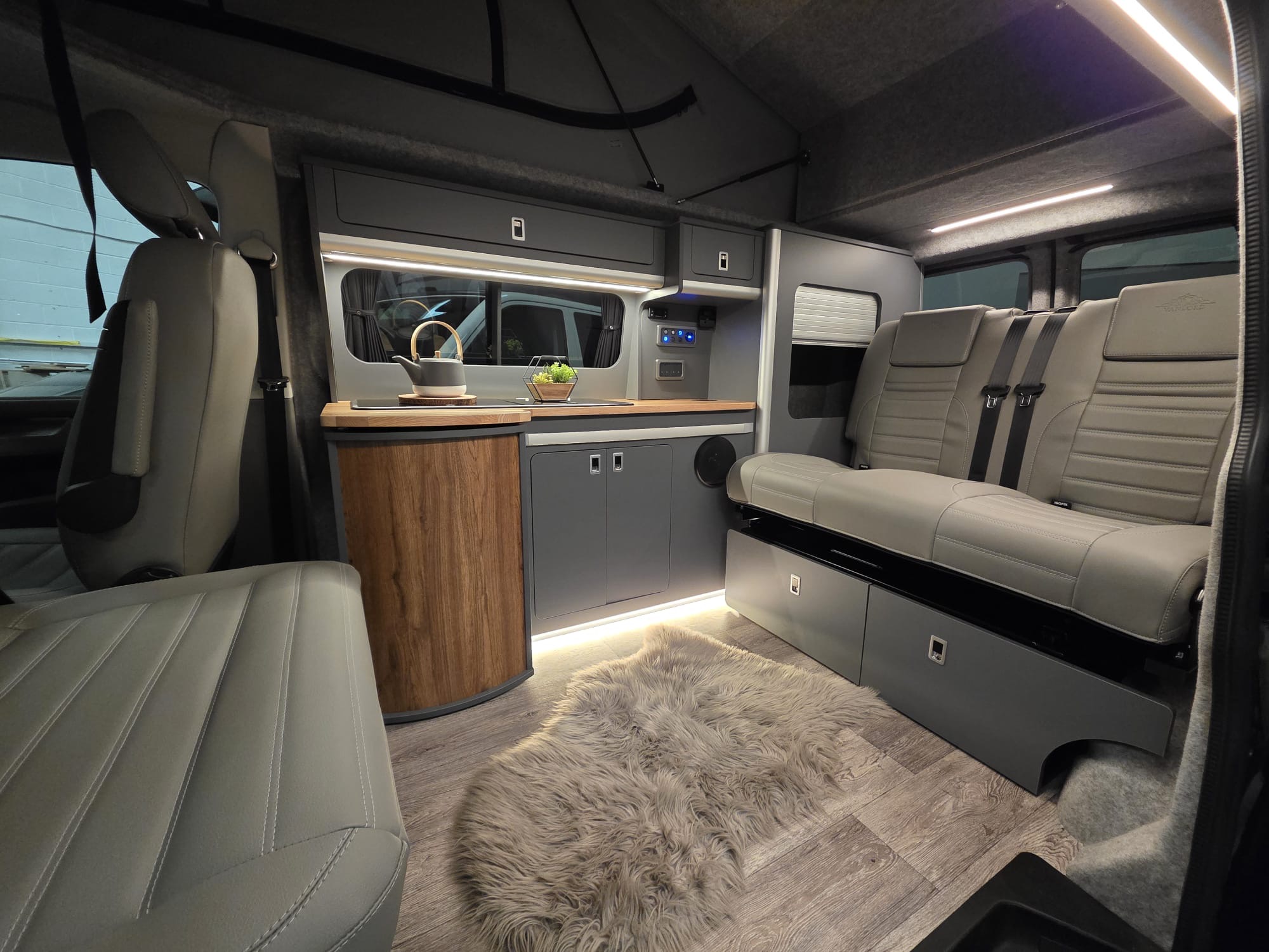Our usual high-end conversion comes loaded with a front M1 Crash Tested passenger swivel base, RIB Altair 112cm Slider bed trimmed in Black leatherette with two integrated ISOFIX points and two full size drawers, 50L fridge-freezer, double gas cooker, Eberspacher diesel heater, bespoke 12V electrical installation with integrated wireless charging pad much more.