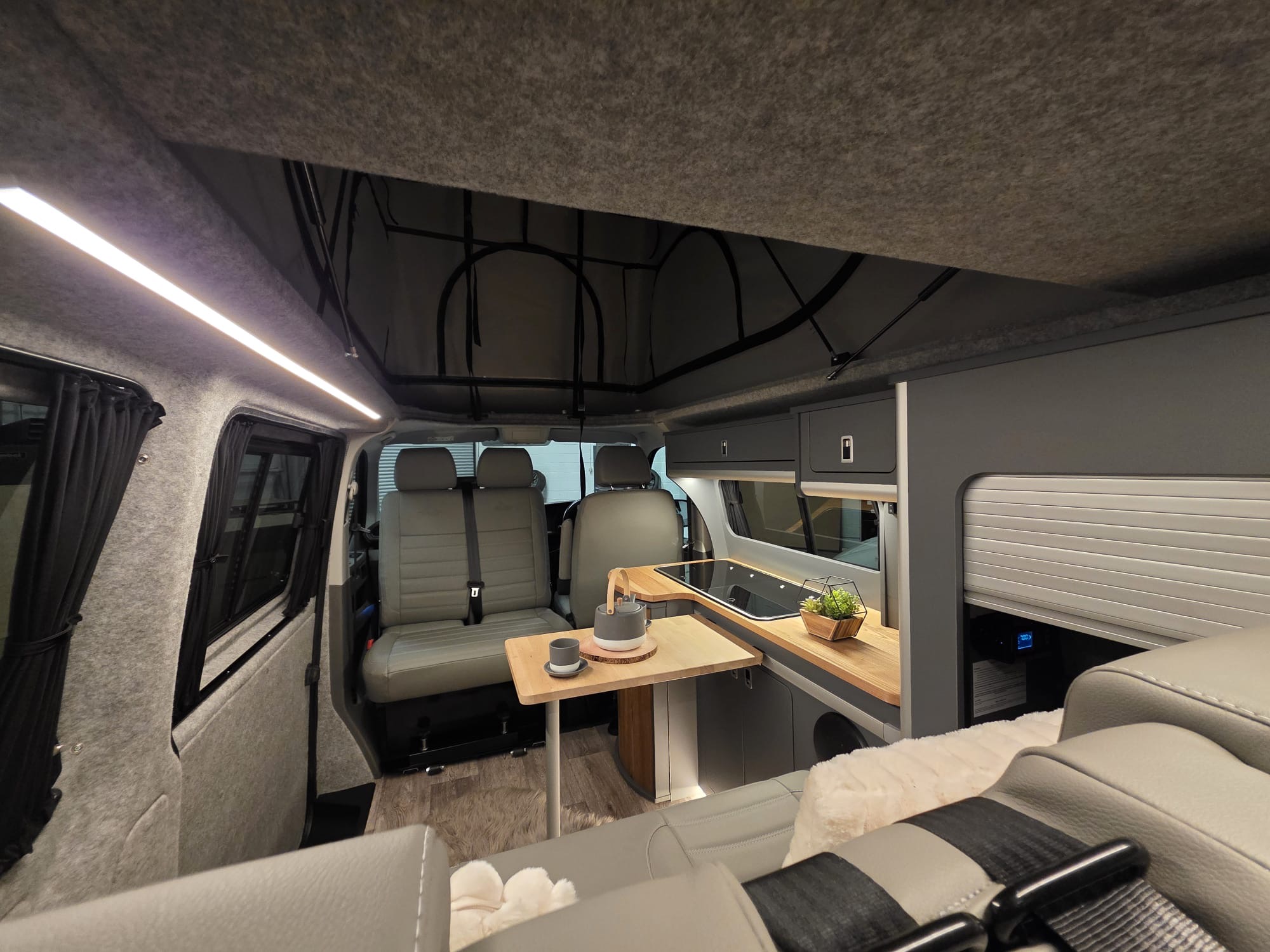 Inside the van you will find our luxury furniture set finished in Matte Light Grey colour which has many soft closing cabinets. The 22mm thick natural oak worktop has been treated to a satin finish. Up top you will find a Bi-Fold bed which allows for extra headroom in the rear and a sliding hatch panel to hide the canvas and straps when the elevating roof is shut.
