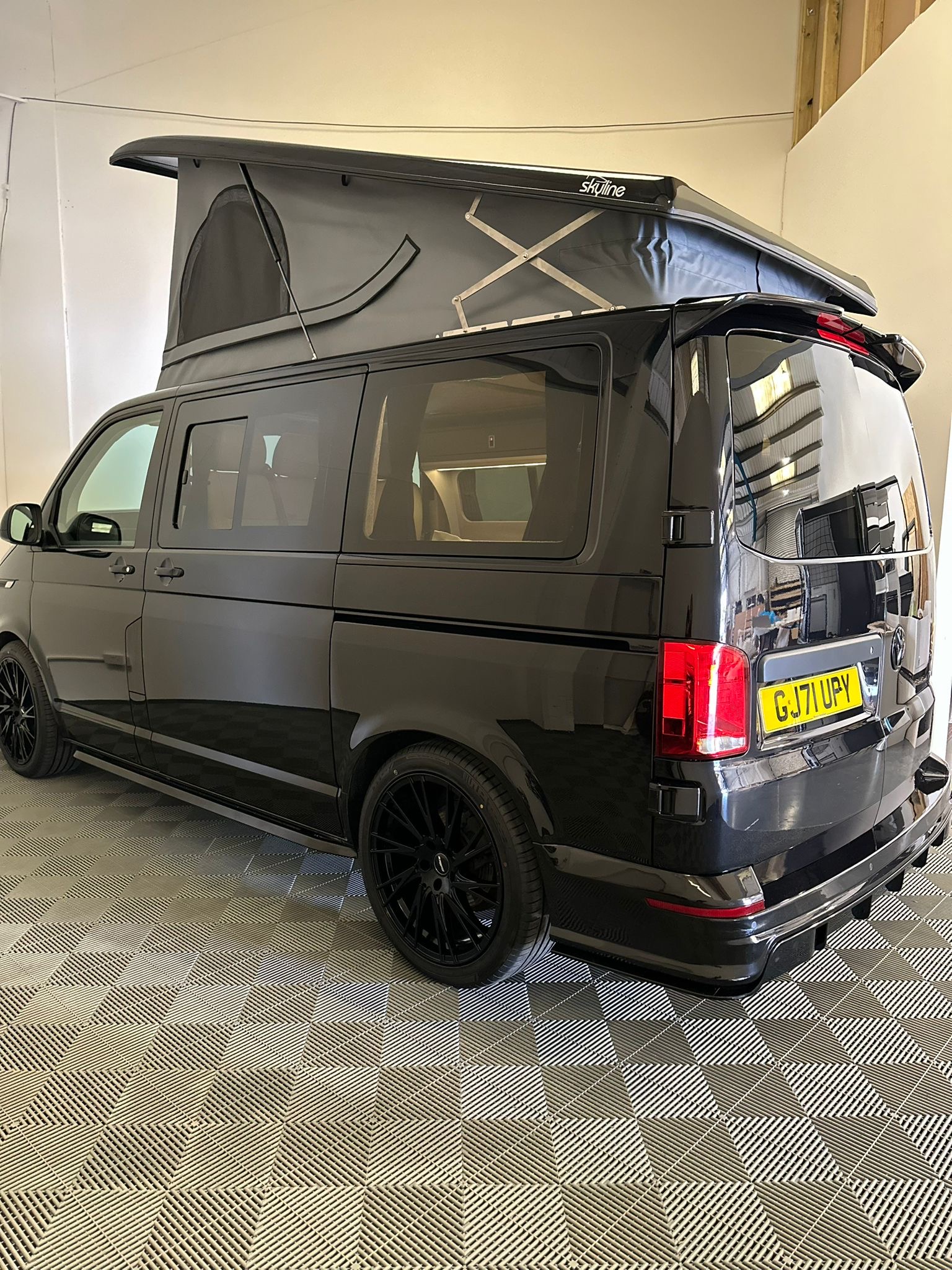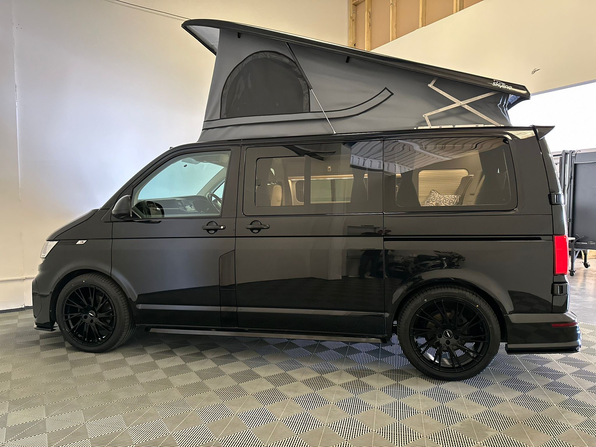 The exterior features colour coded front and rear bumpers with gloss black lip, gloss black lower and badged front grilles, gloss black trapezoid side bars, gloss black barn door spoiler. The van is lowered by 40mm and sits on load rated 20″ Calibre Gloss Black wheels and new tyres. Up top it has a Skyline elevating roof with a scenic canvas and a 200W solar panel.