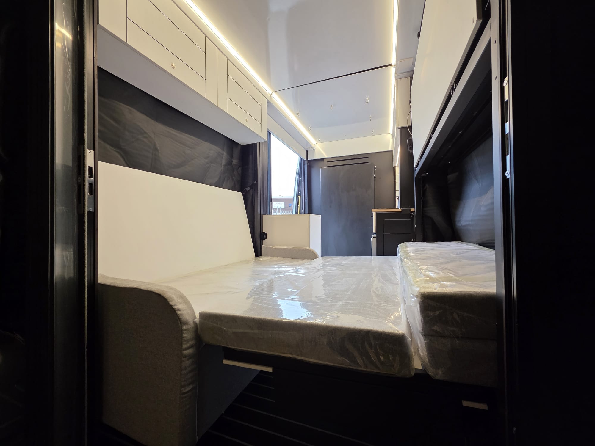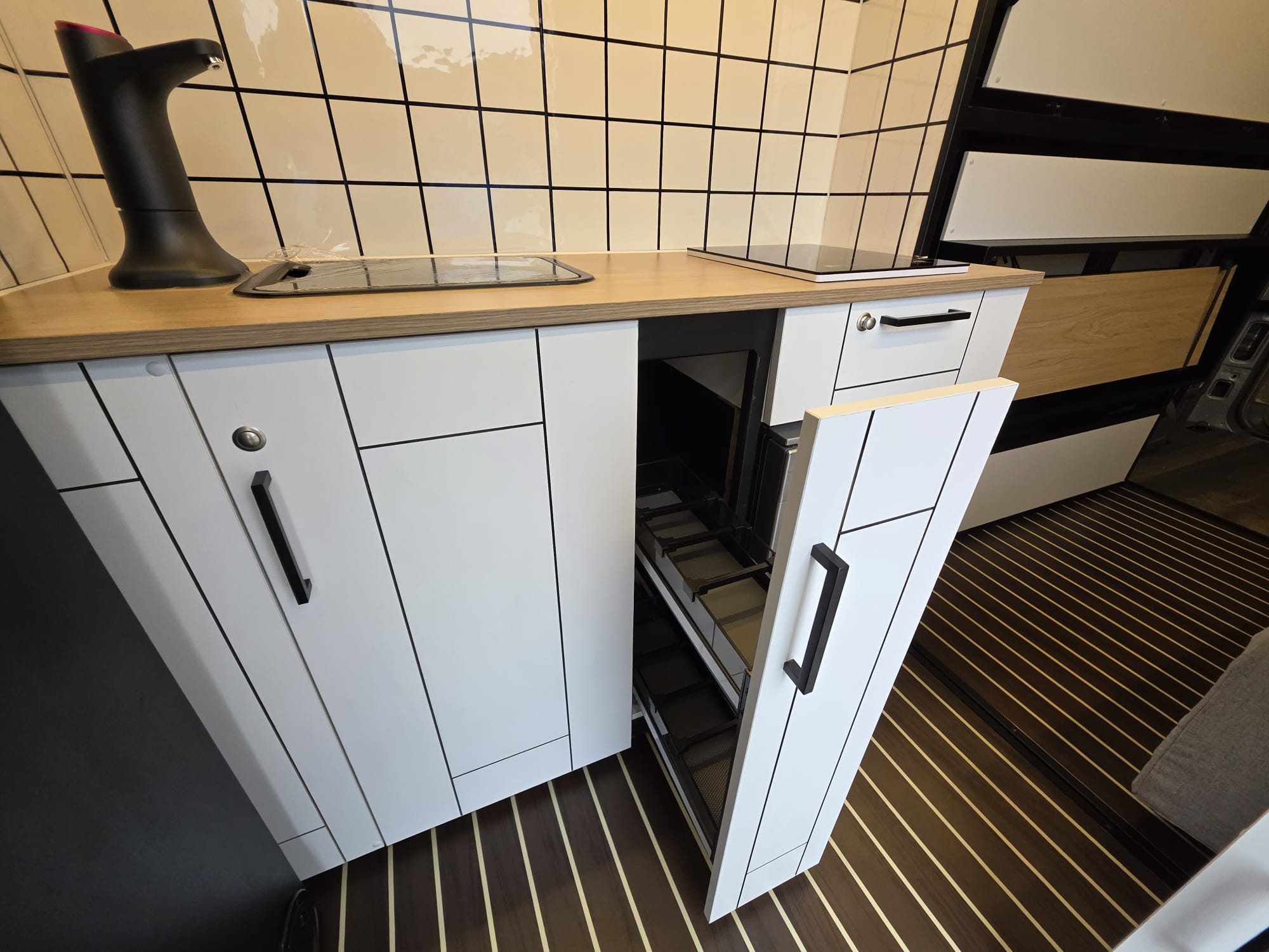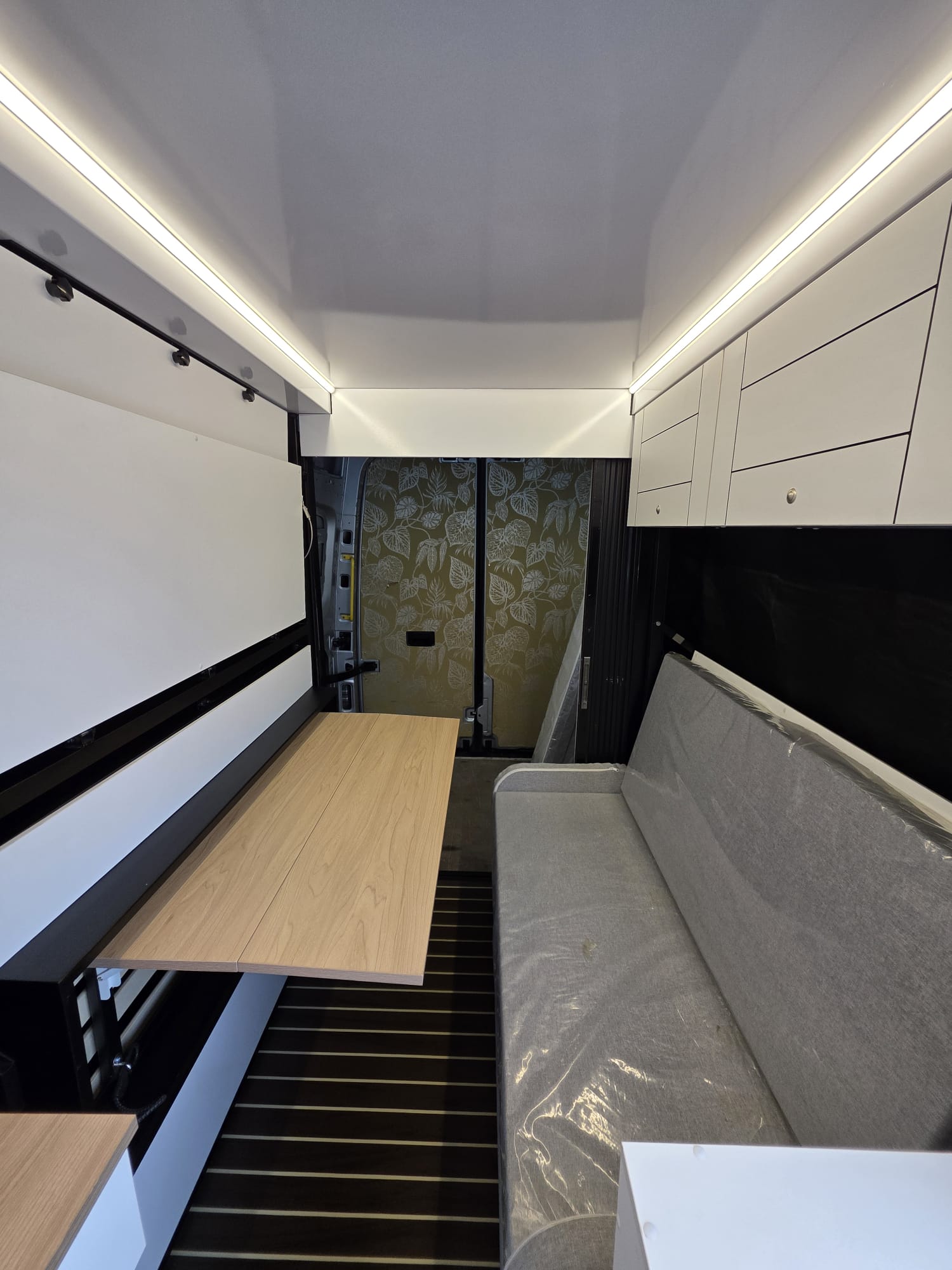 Only one in the UK – Completely removable camper pod which transforms your regular business van to a camper in just 2 hours! The pod is divided into two sections, each of which comes on its own trolley. Simply slide it in, strap it down with cargo straps and you’re ready to go! The pod features a full size kitchen with an electric hob, sink with an electric water tap, onboard fresh and waste water tanks, modular folding down shower with curtain, folding entry doors to both ends, a sofa which turns into a full size double bed, folding table and a drop down bunk bed for a child, multiple cupboards and storage compartments, LED lights throughout. The whole module is powered by a lithium 12V/240V power bank.