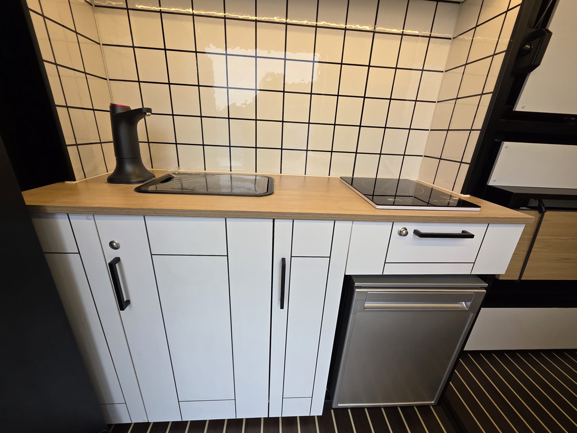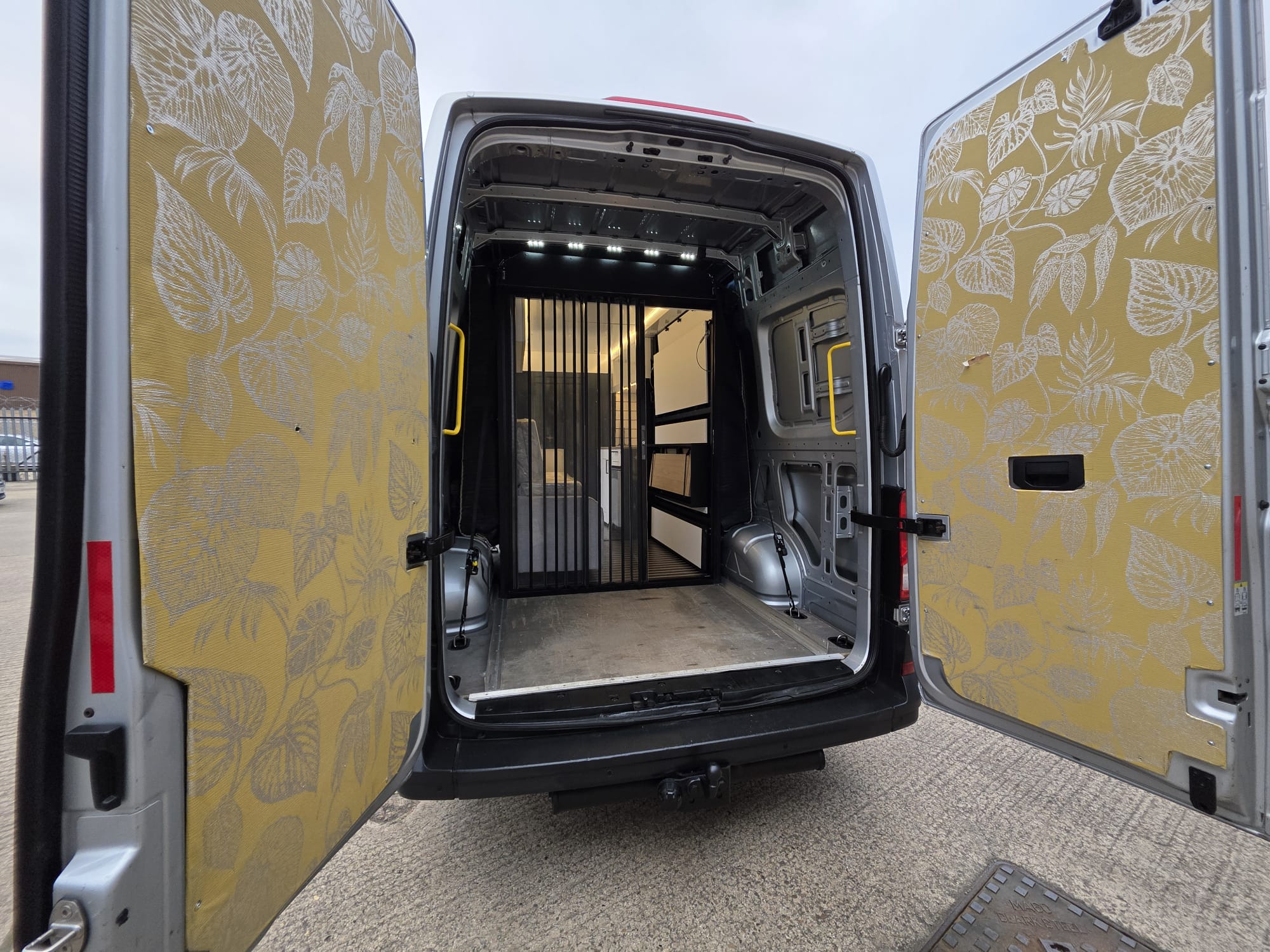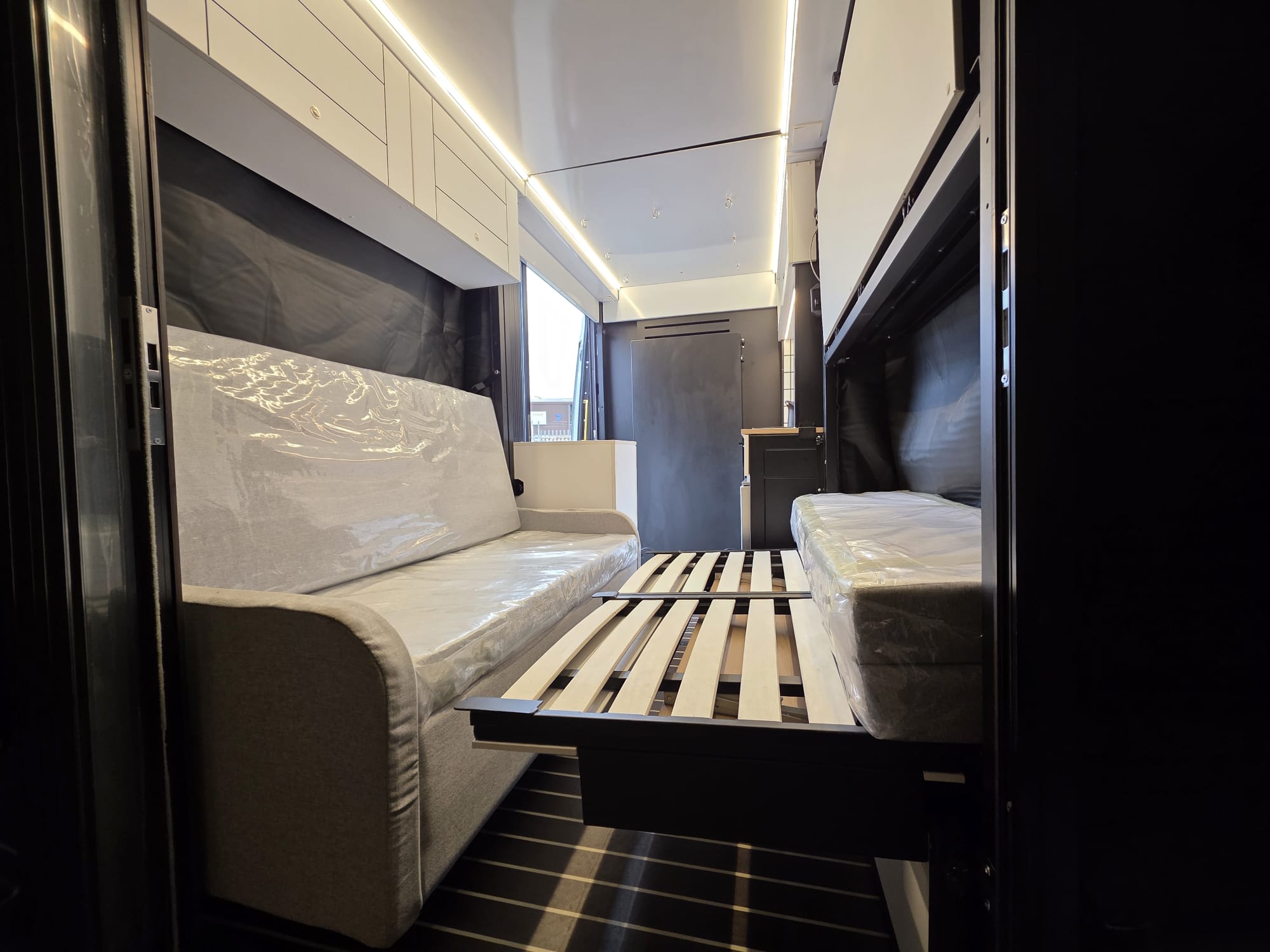 Only one in the UK – Completely removable camper pod which transforms your regular business van to a camper in just 2 hours! The pod is divided into two sections, each of which comes on its own trolley. Simply slide it in, strap it down with cargo straps and you’re ready to go! The pod features a full size kitchen with an electric hob, sink with an electric water tap, onboard fresh and waste water tanks, modular folding down shower with curtain, folding entry doors to both ends, a sofa which turns into a full size double bed, folding table and a drop down bunk bed for a child, multiple cupboards and storage compartments, LED lights throughout. The whole module is powered by a lithium 12V/240V power bank.