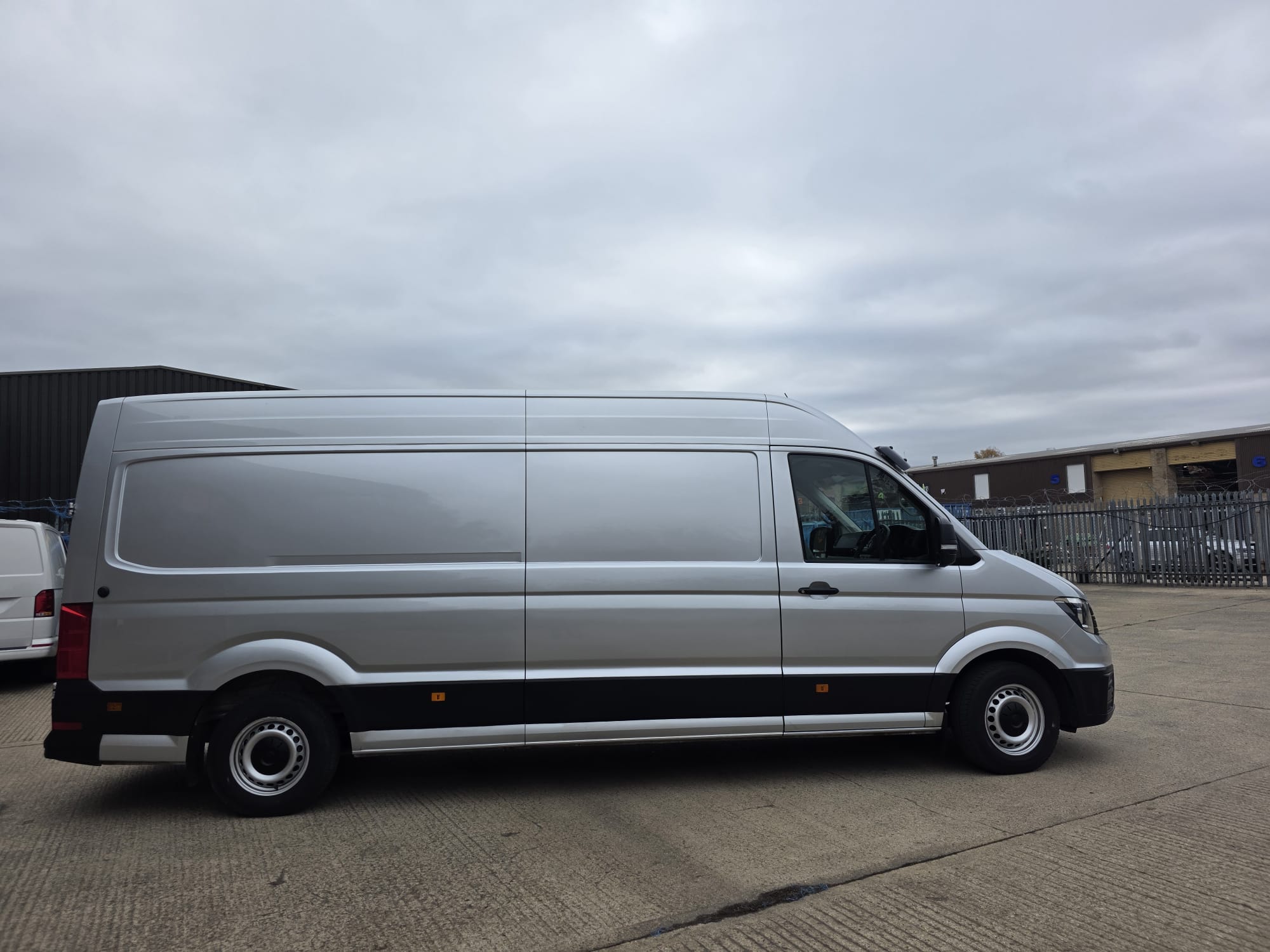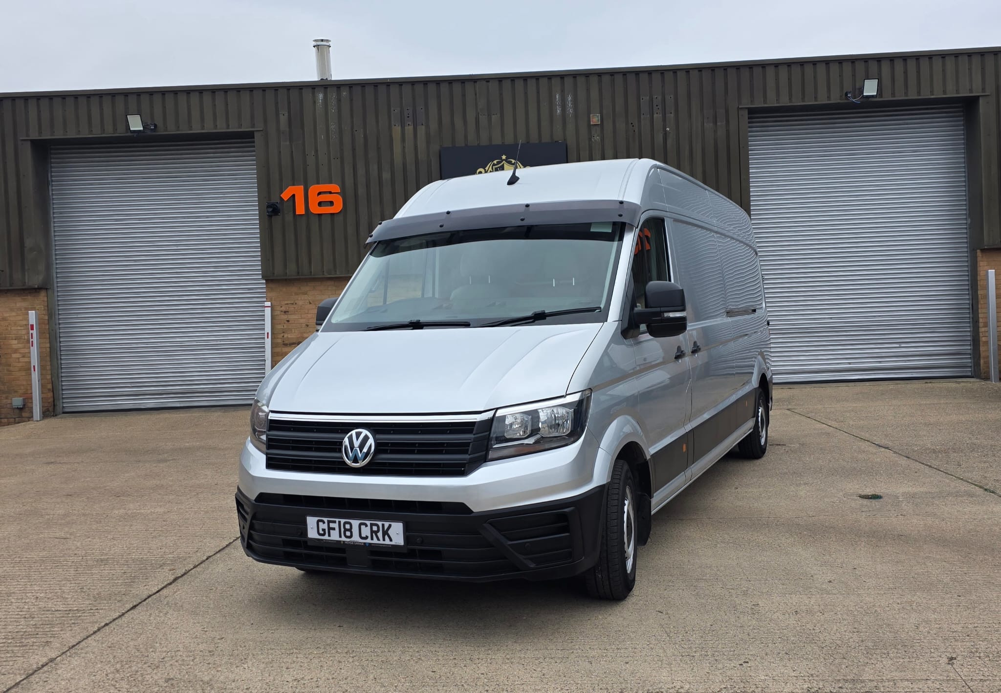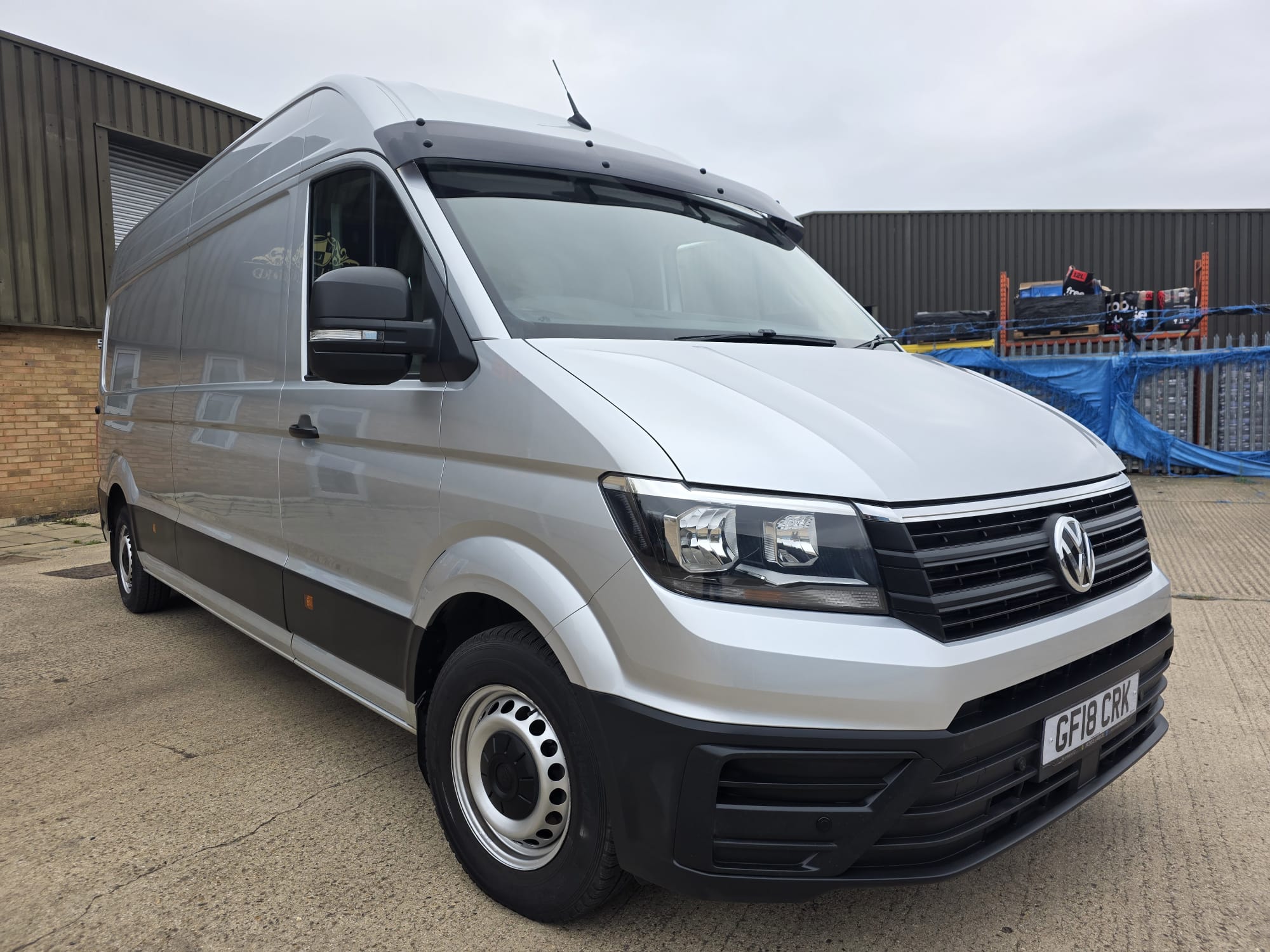 2018 VW Crafter CR35 Trendline L3H3 in Reflex Silver, powered by the 140BHP Euro 6 ULEZ-free Engine with a 6 speed manual gearbox. Genuine 76,583 miles on the clock, HPI clear, full VW service history, 2 remote keys, 2 owners, long MOT, cambelt, water pump and service by us and ready to go.