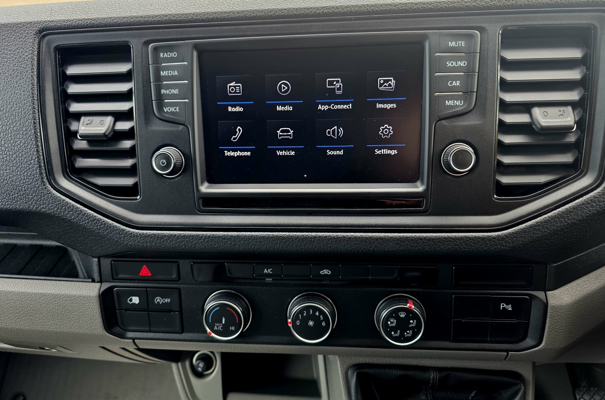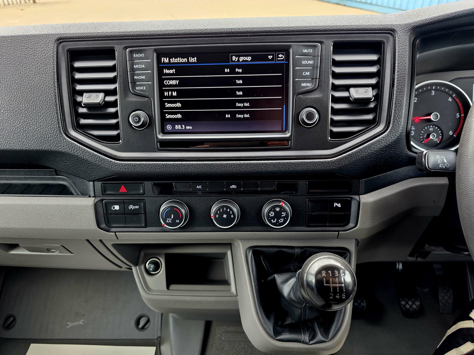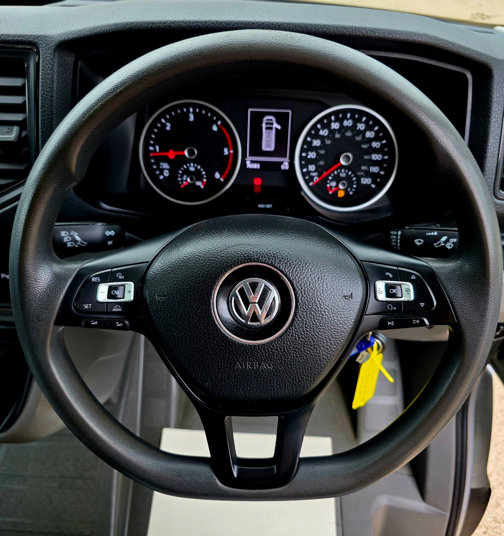 2018 VW Crafter CR35 Trendline L3H3 in Reflex Silver, powered by the 140BHP Euro 6 ULEZ-free Engine with a 6 speed manual gearbox. Genuine 76,583 miles on the clock, HPI clear, full VW service history, 2 remote keys, 2 owners, long MOT, cambelt, water pump and service by us and ready to go.