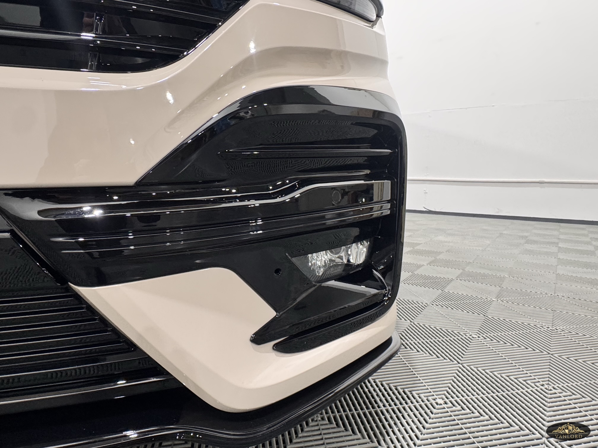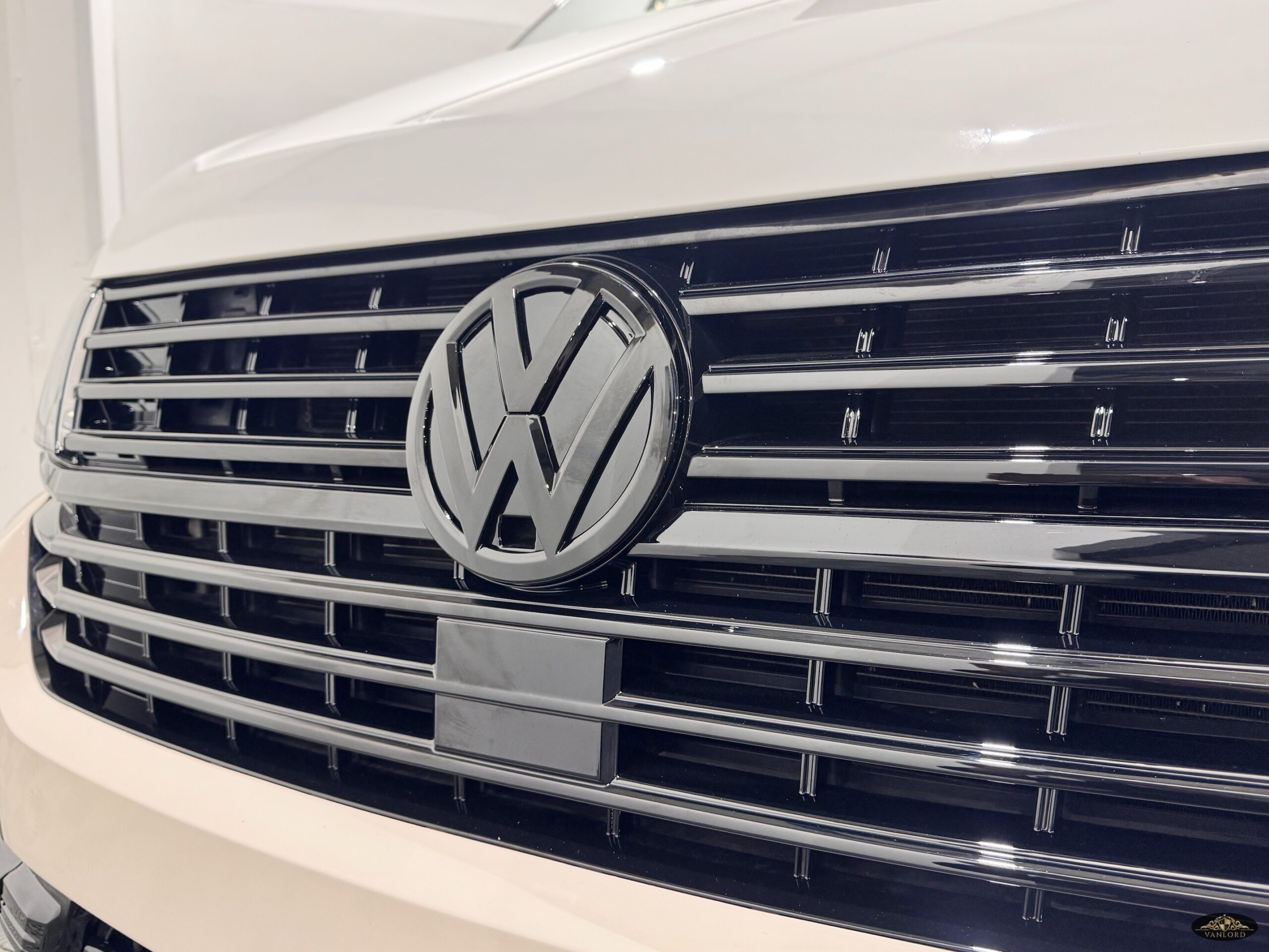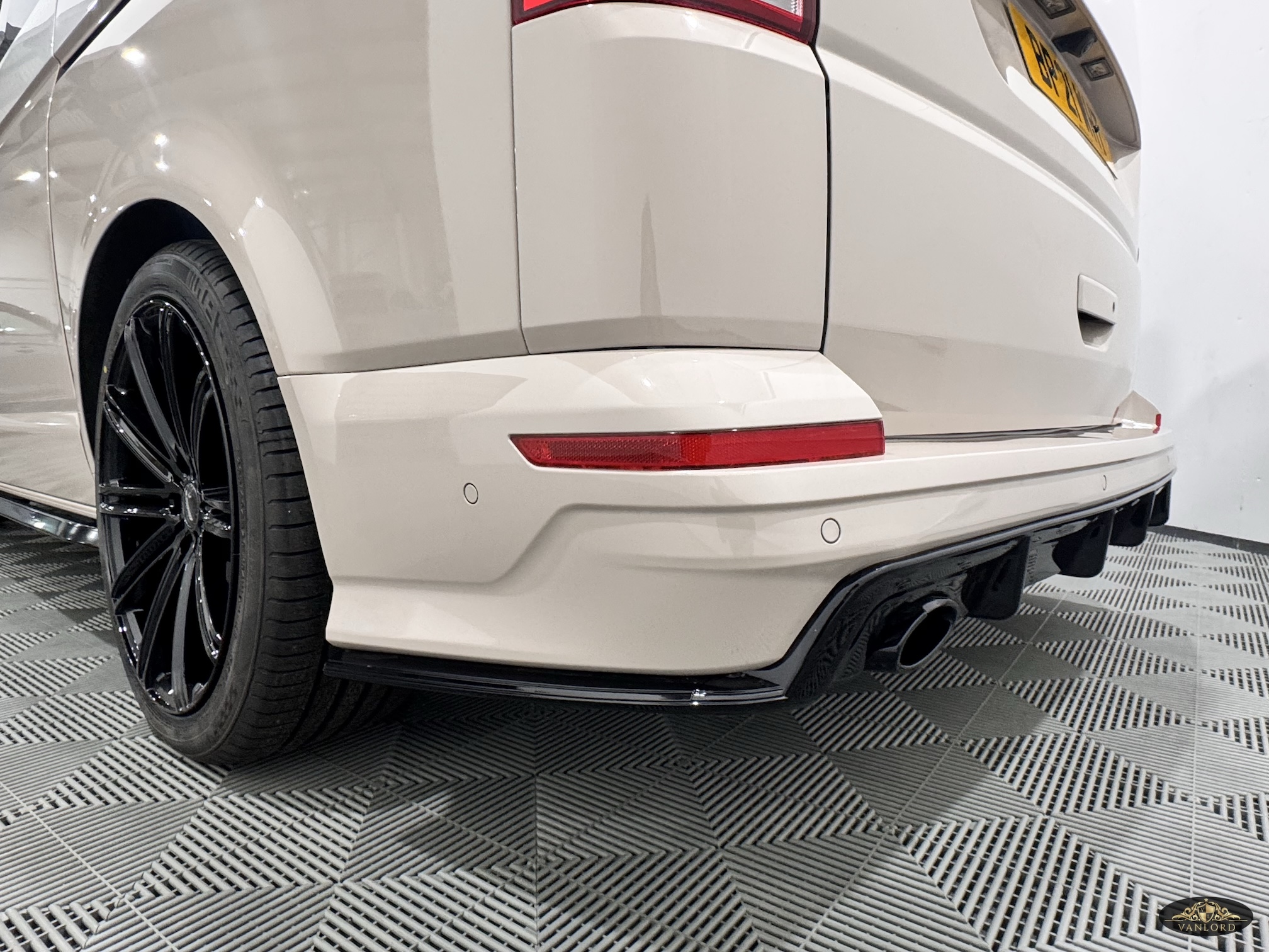 The exterior features colour coded front and rear bumpers with gloss black lip, gloss black lower and badged front grilles, gloss black trapezoid side bars, gloss white tailgate spoiler. The van is lowered by 40mm and sits on load rated 20″ Calibre Gloss Black wheels and new tyres. Up top it has a Skyline elevating roof with a scenic canvas and a 200W solar panel.