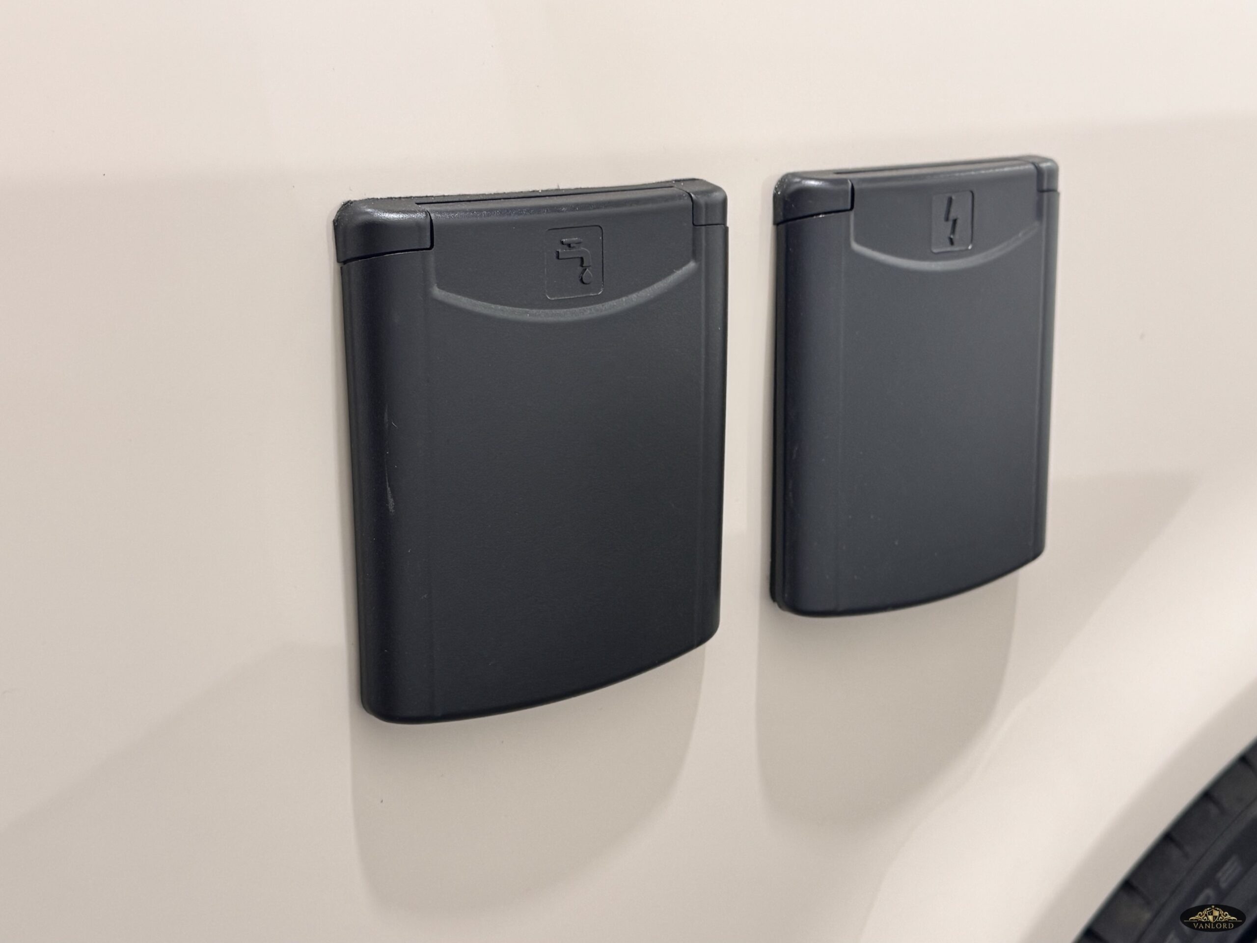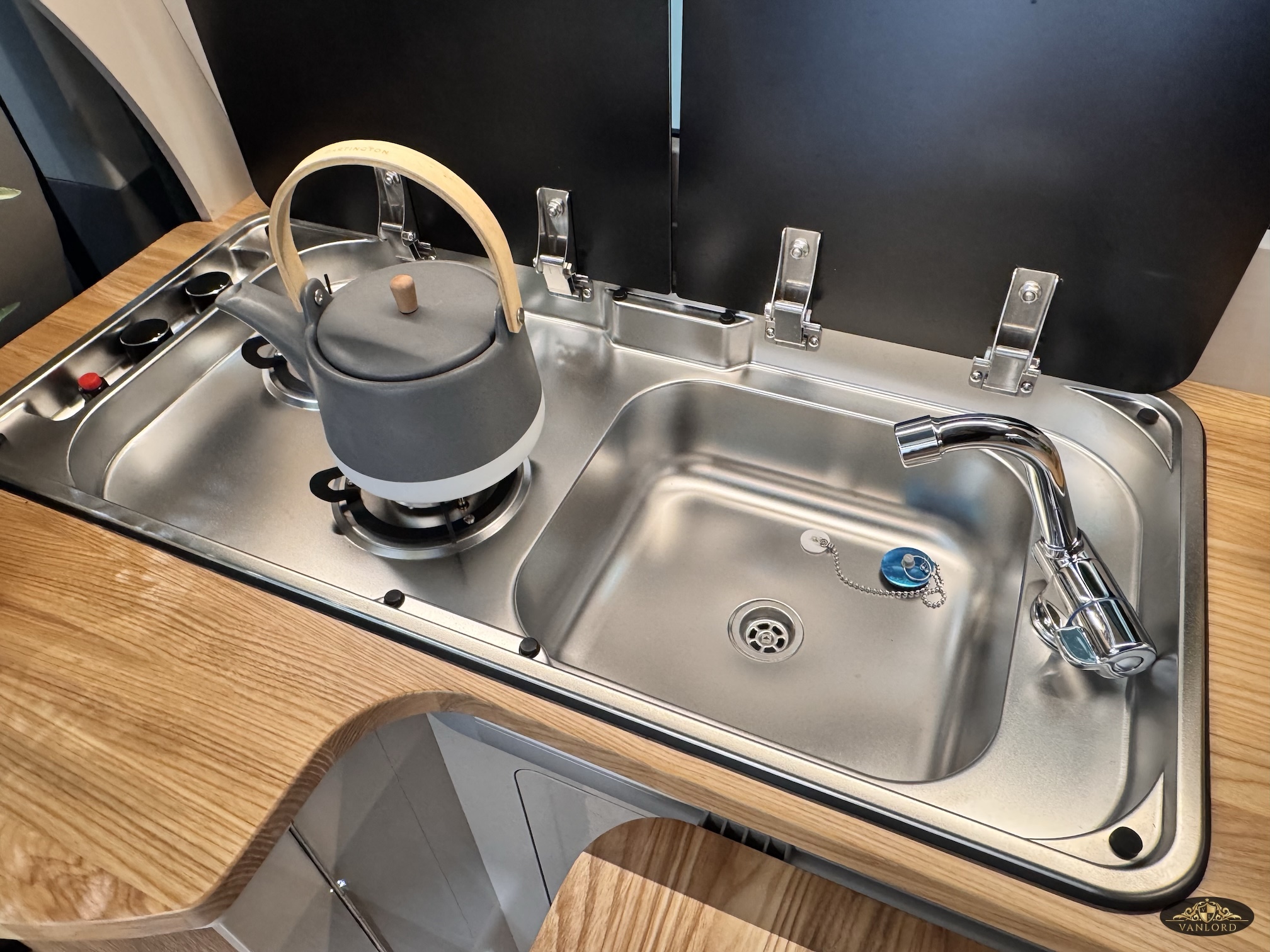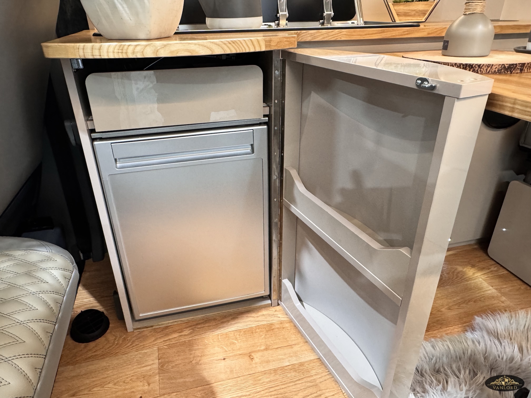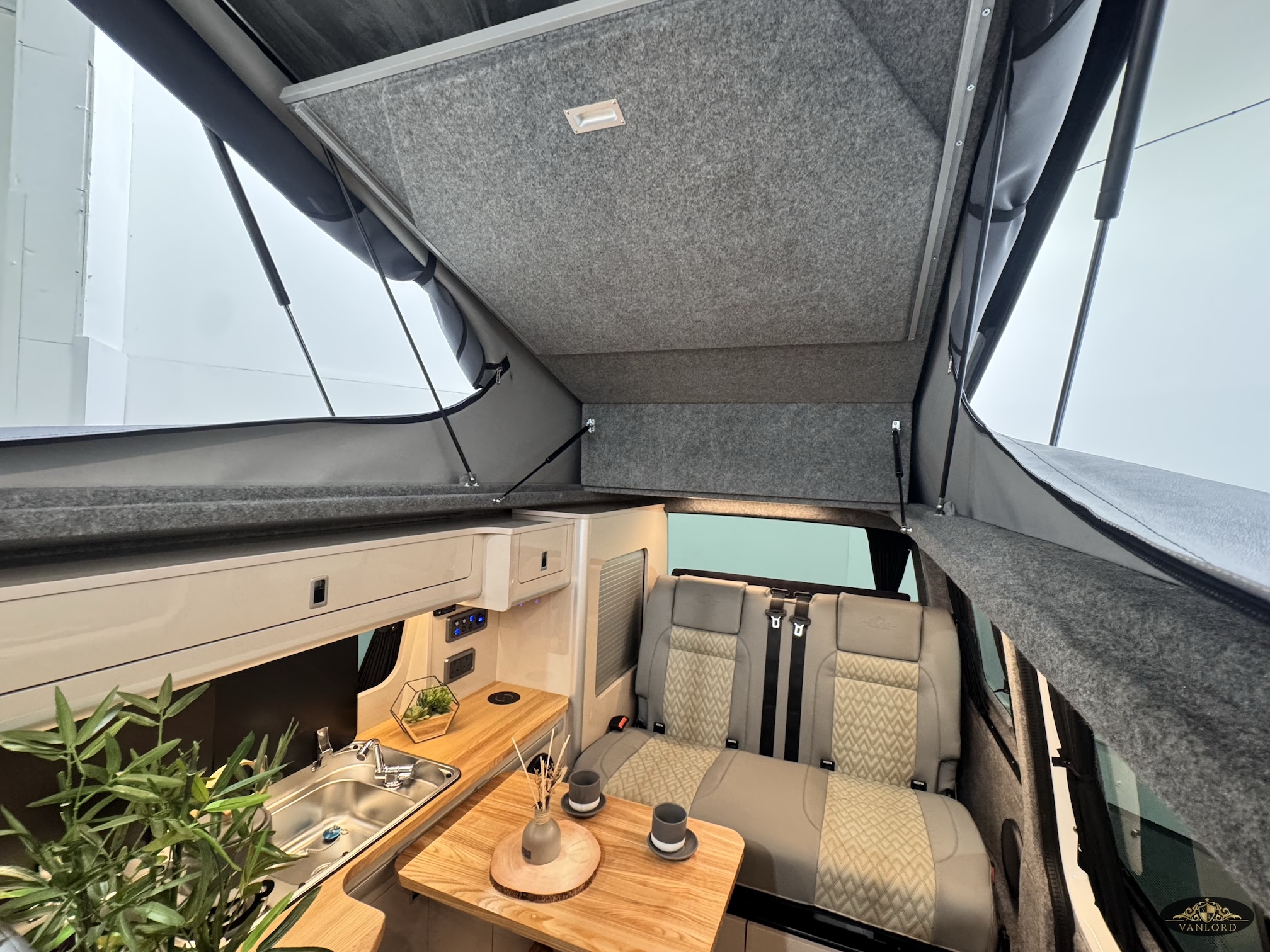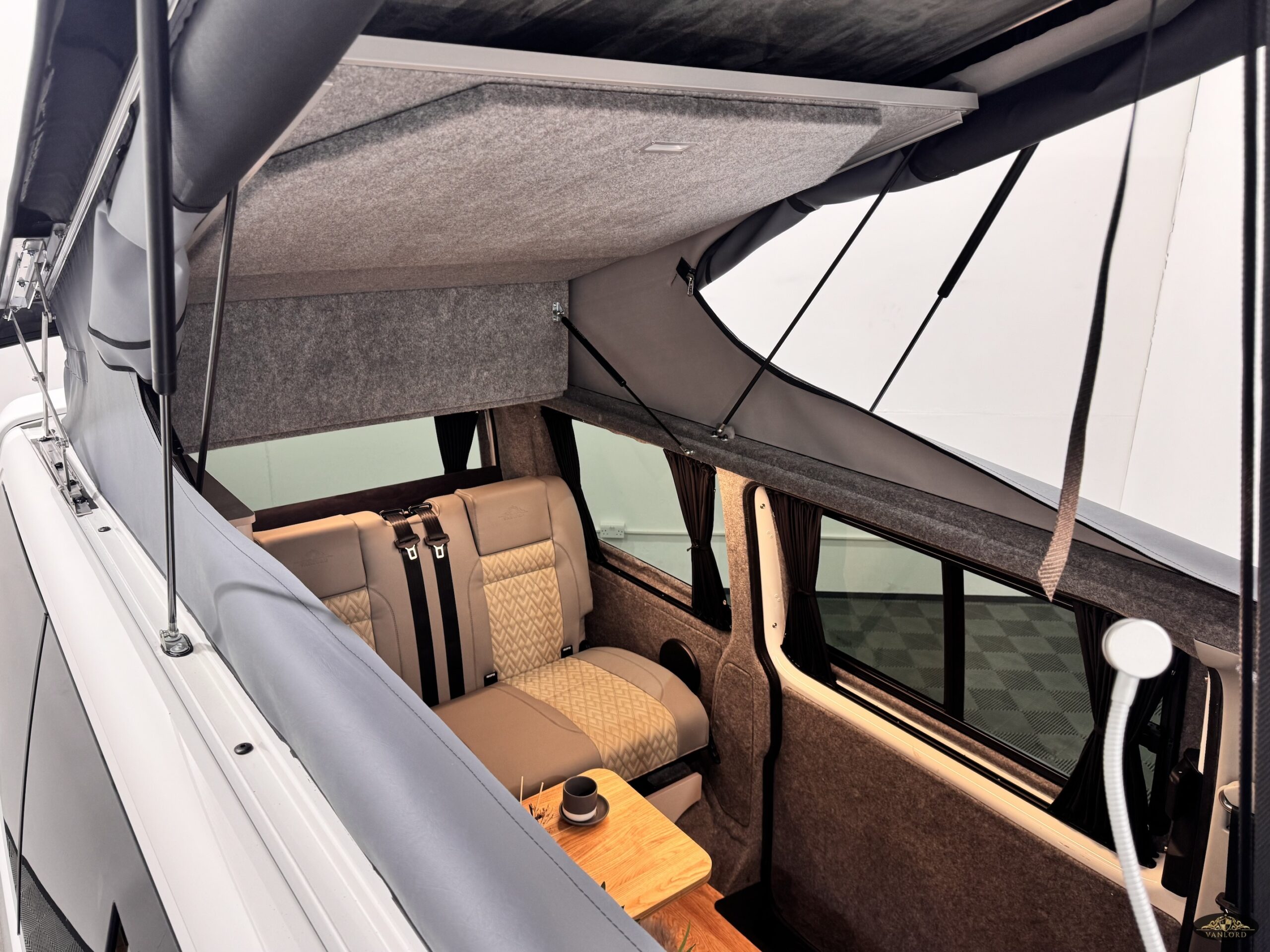 Inside the van you will find our luxury furniture set finished in Gloss Cashmere colour which has many soft closing cabinets. The 22mm thick natural oak worktop has been treated to a satin finish. Up top you will find a Bi-Fold bed which allows for extra headroom in the rear and a sliding hatch panel to hide the canvas and straps when the elevating roof is shut.