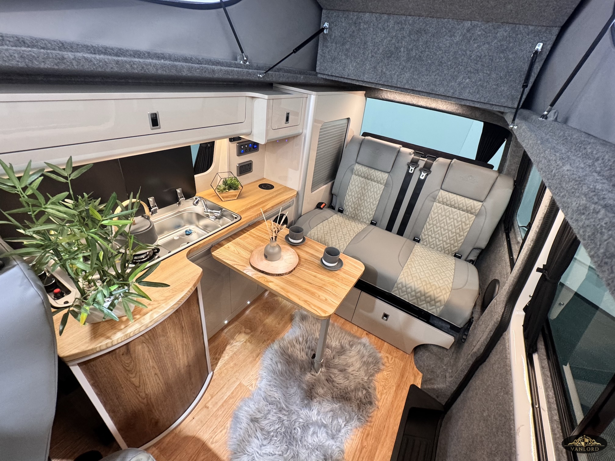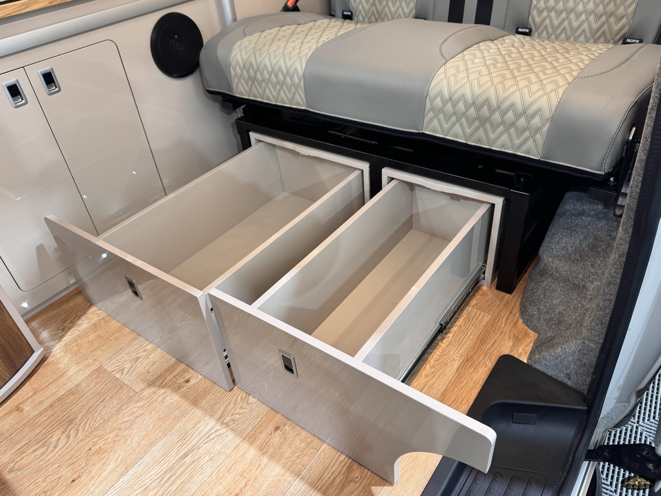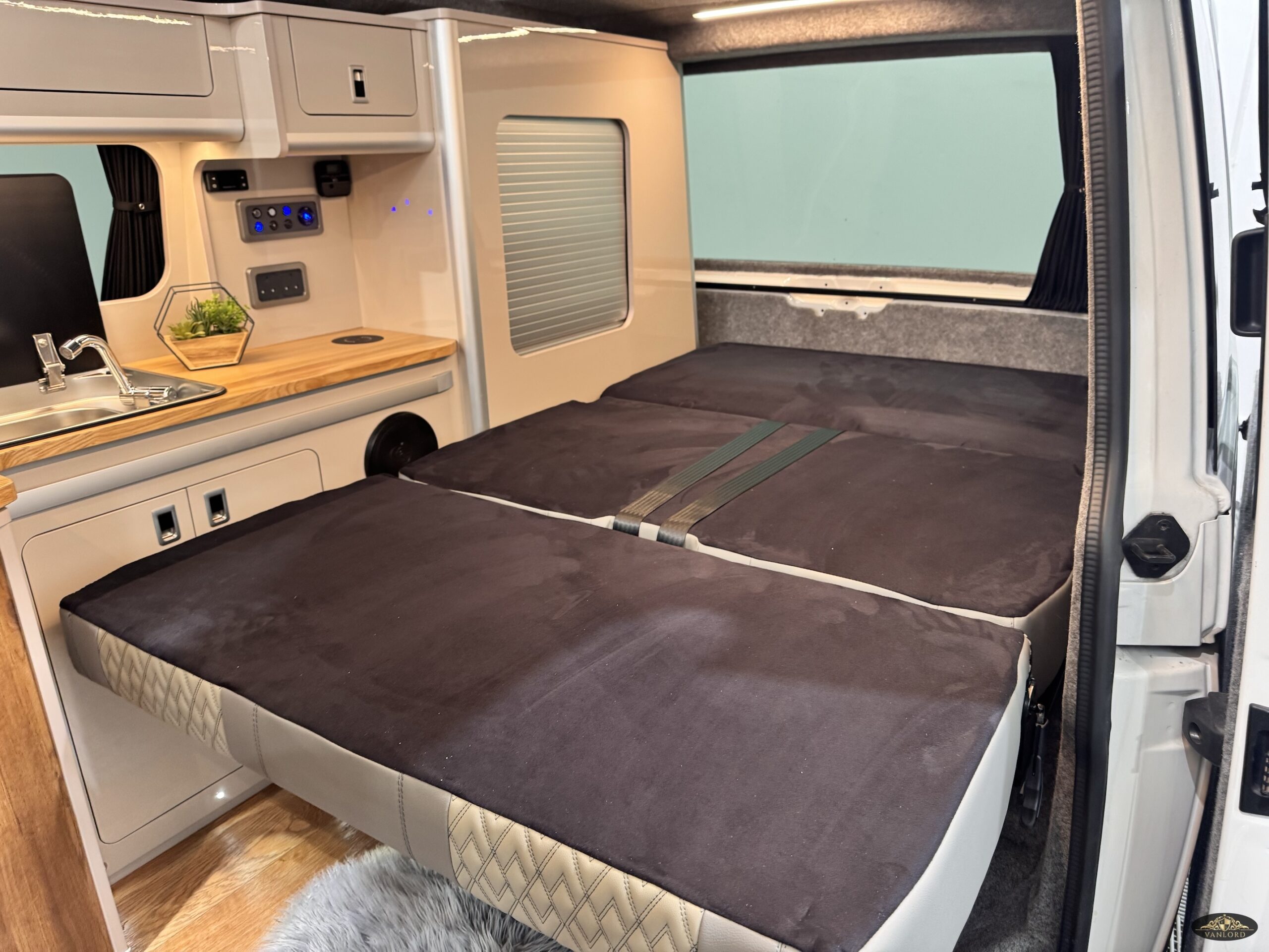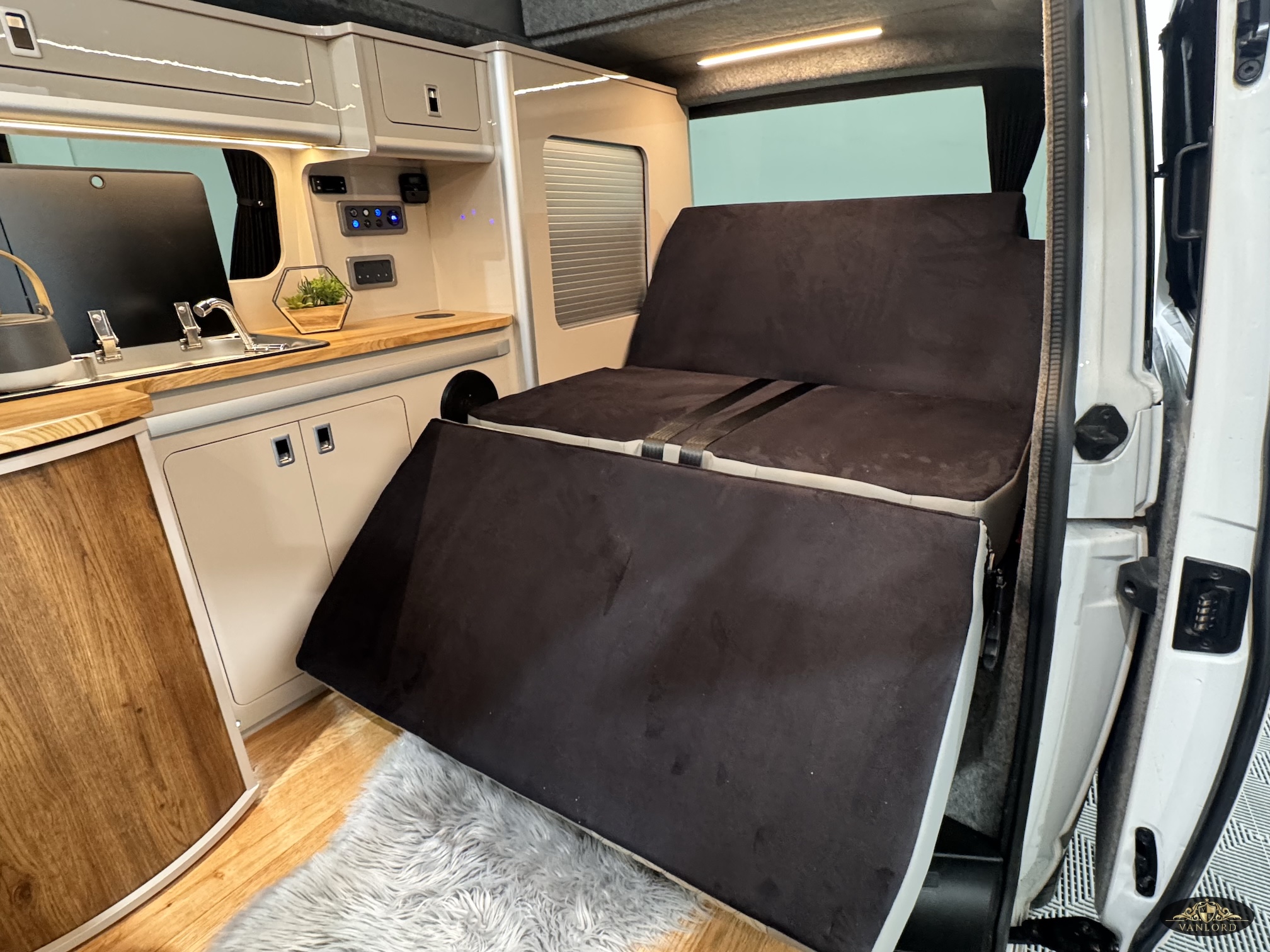Our usual high-end conversion comes loaded with a front TUV approved passenger swivel base, RIB Altair 112cm Slider bed trimmed in Grey-Cream leatherette with two integrated ISOFIX points and two full size drawers, 50L fridge-freezer, double gas cooker, Eberspacher diesel heater, bespoke 12V electrical installation with integrated wireless charging pad much more.