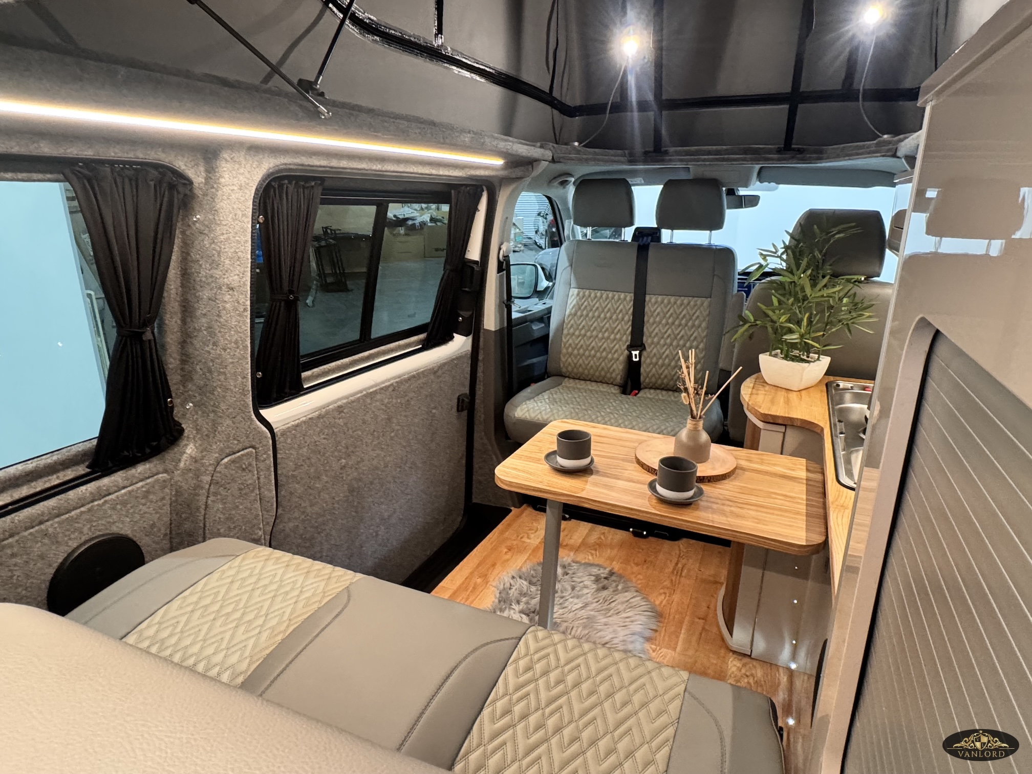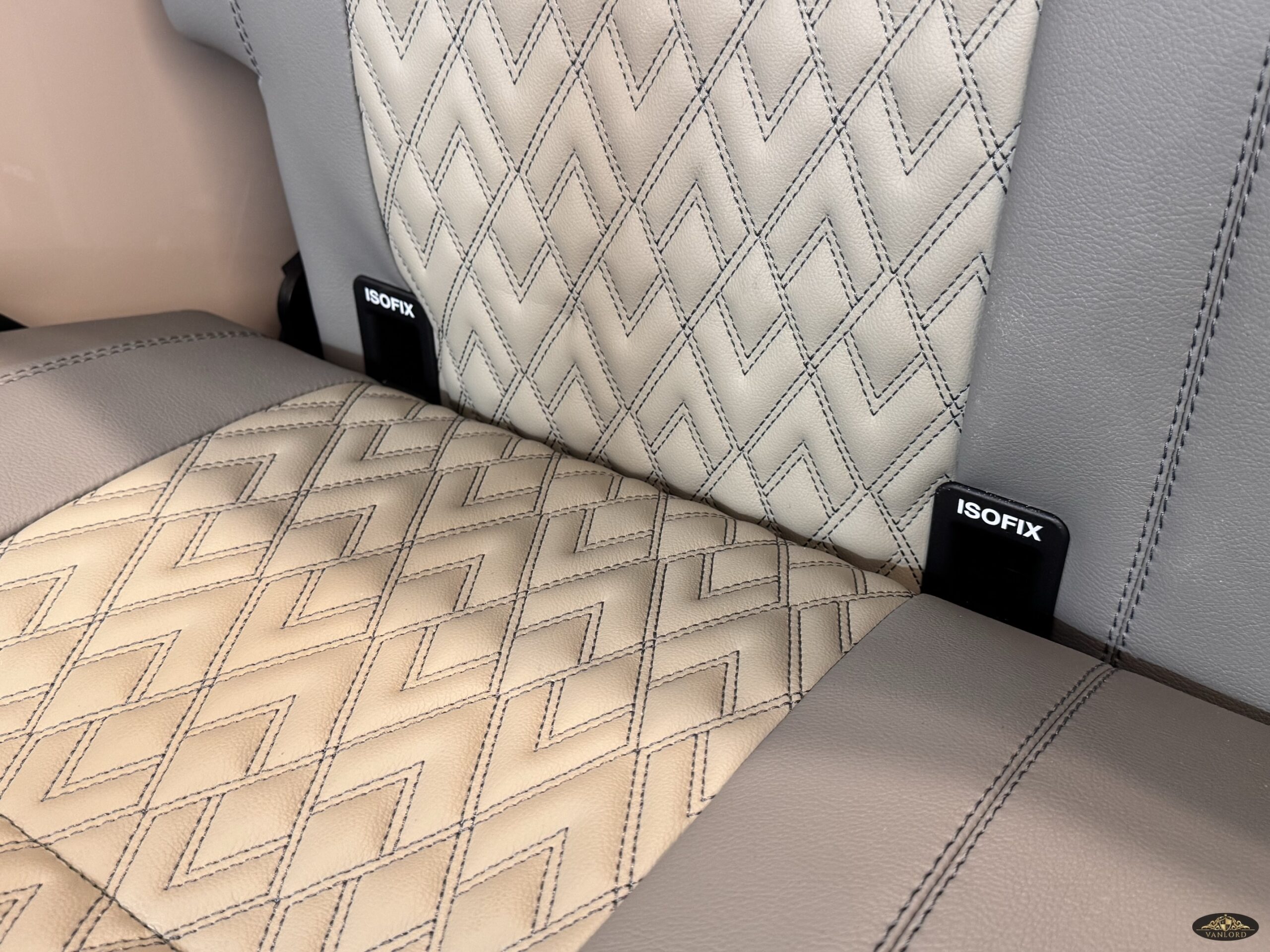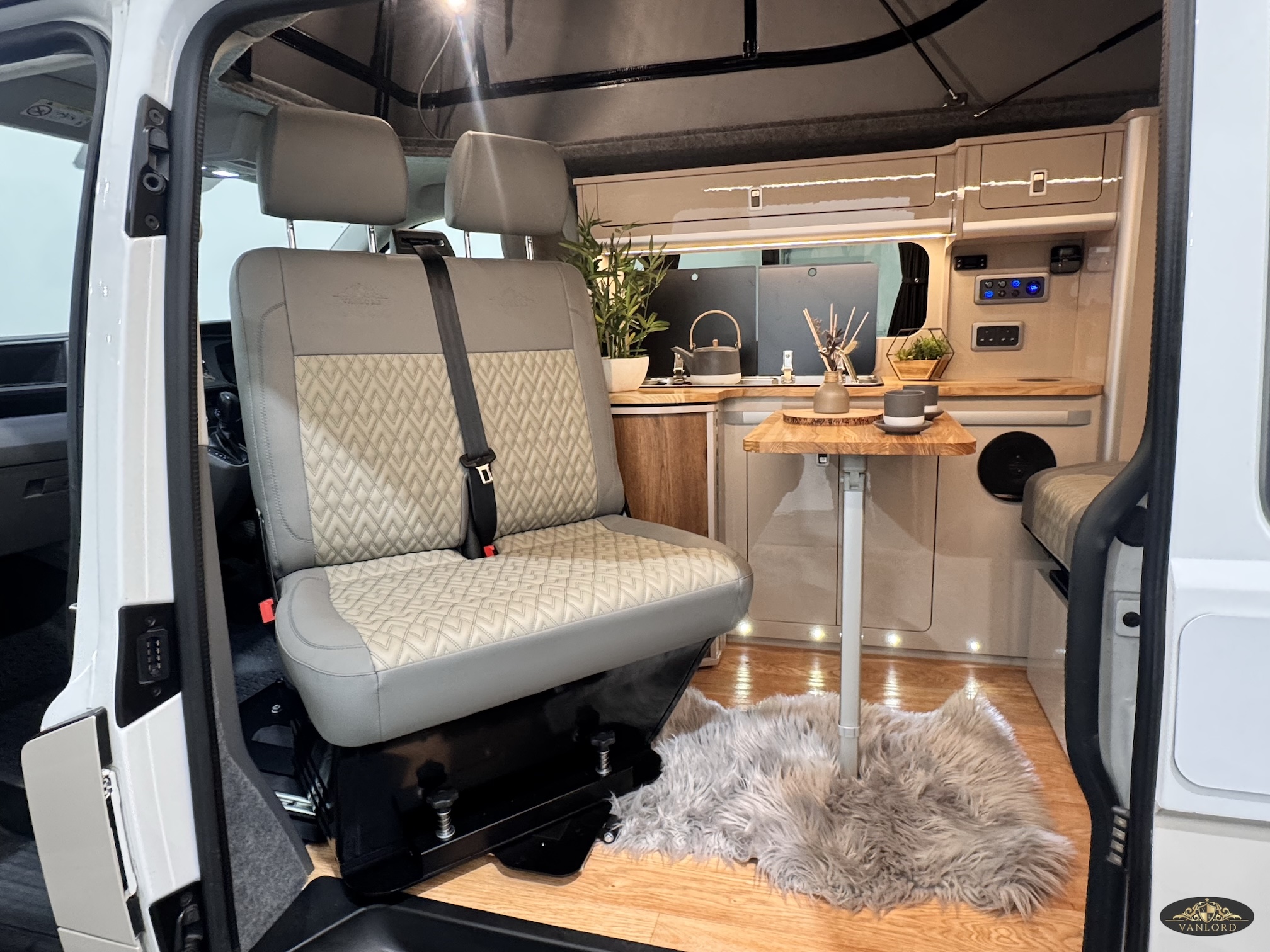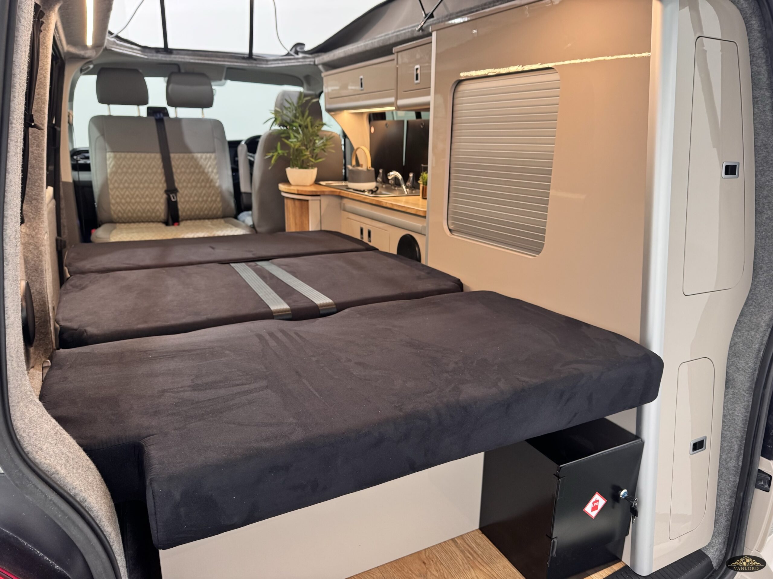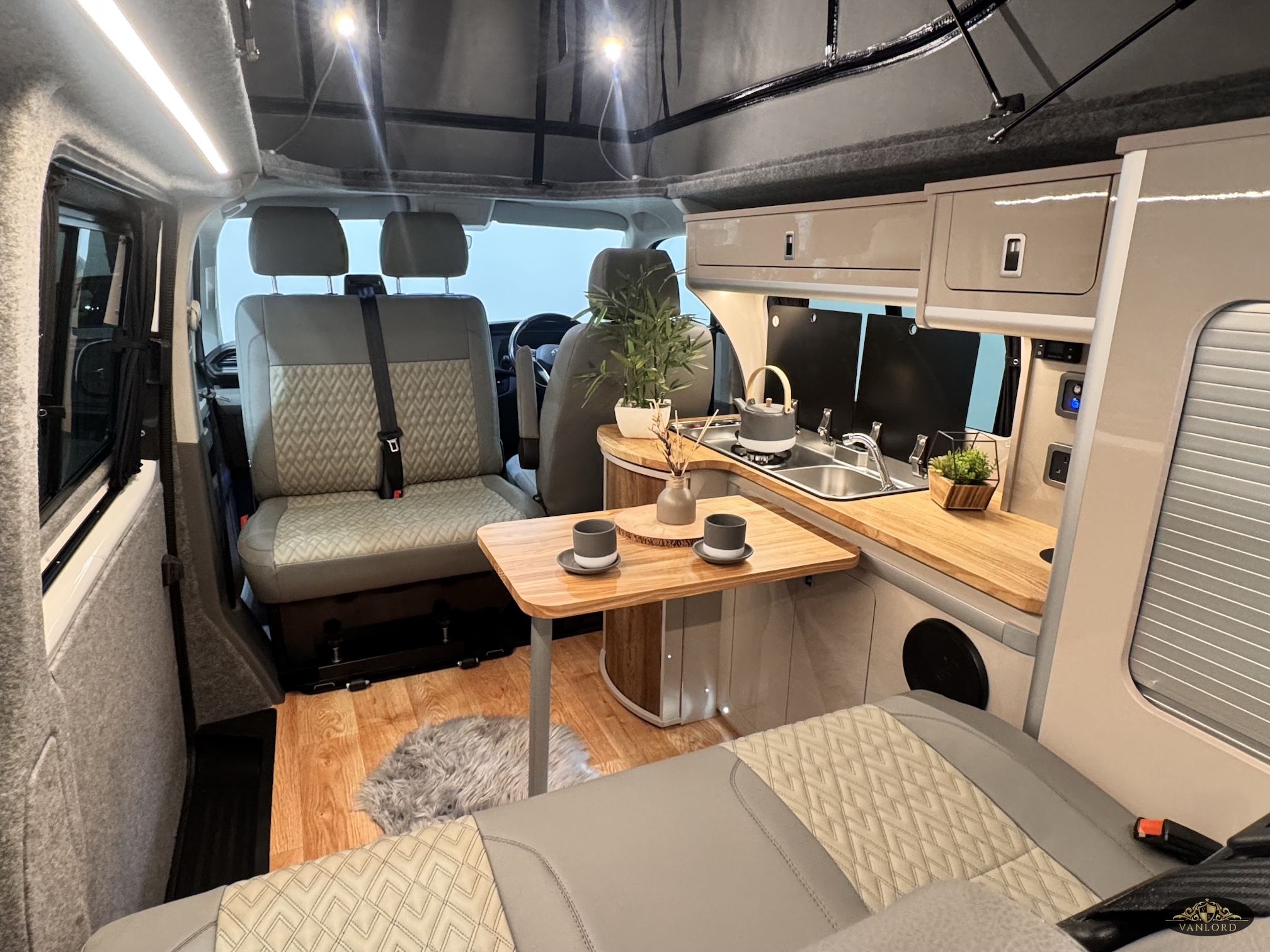 Our usual high-end conversion comes loaded with a front TUV approved passenger swivel base, RIB Altair 112cm Slider bed trimmed in Grey-Cream leatherette with two integrated ISOFIX points and two full size drawers, 50L fridge-freezer, double gas cooker, Eberspacher diesel heater, bespoke 12V electrical installation with integrated wireless charging pad much more.