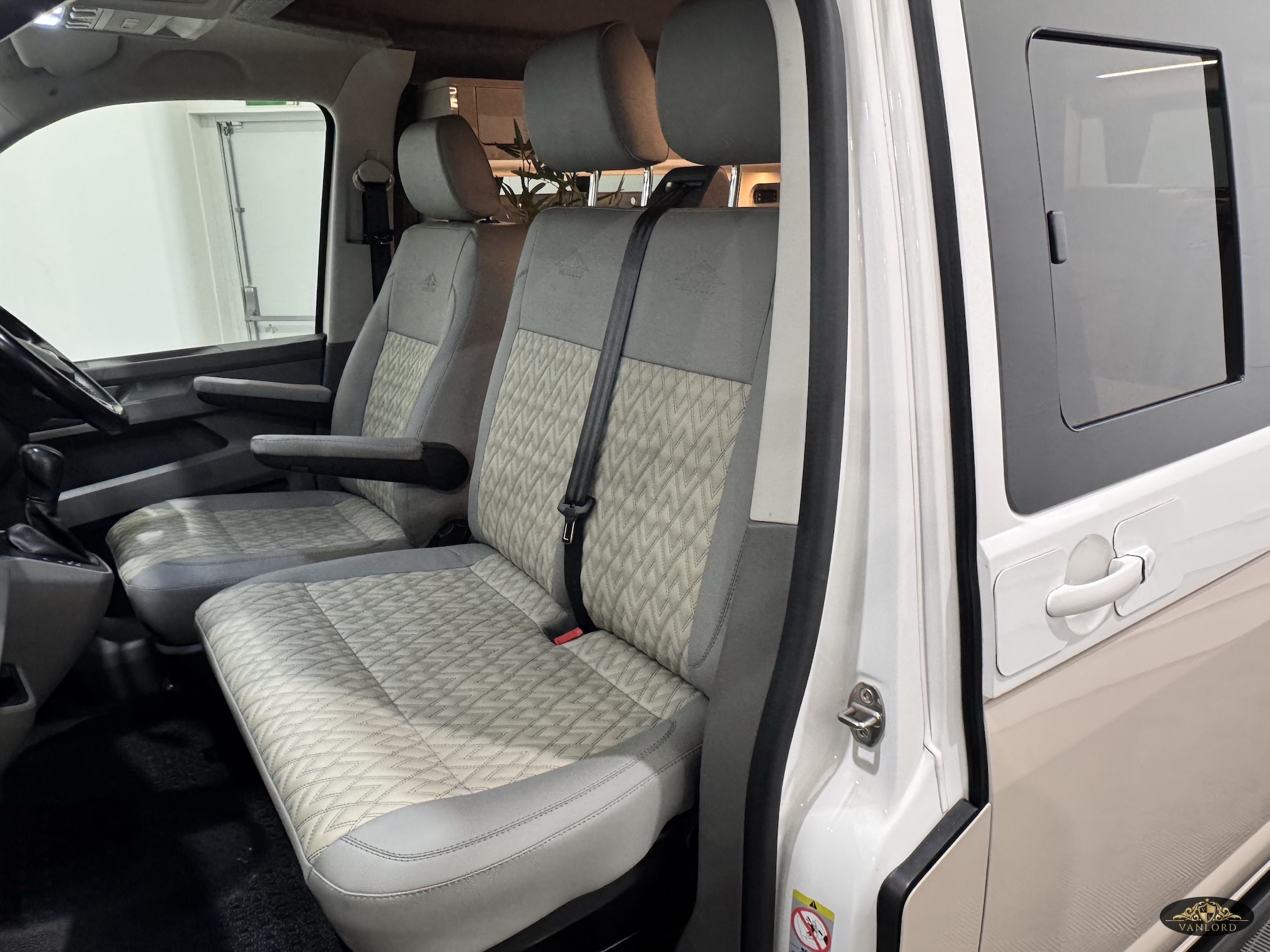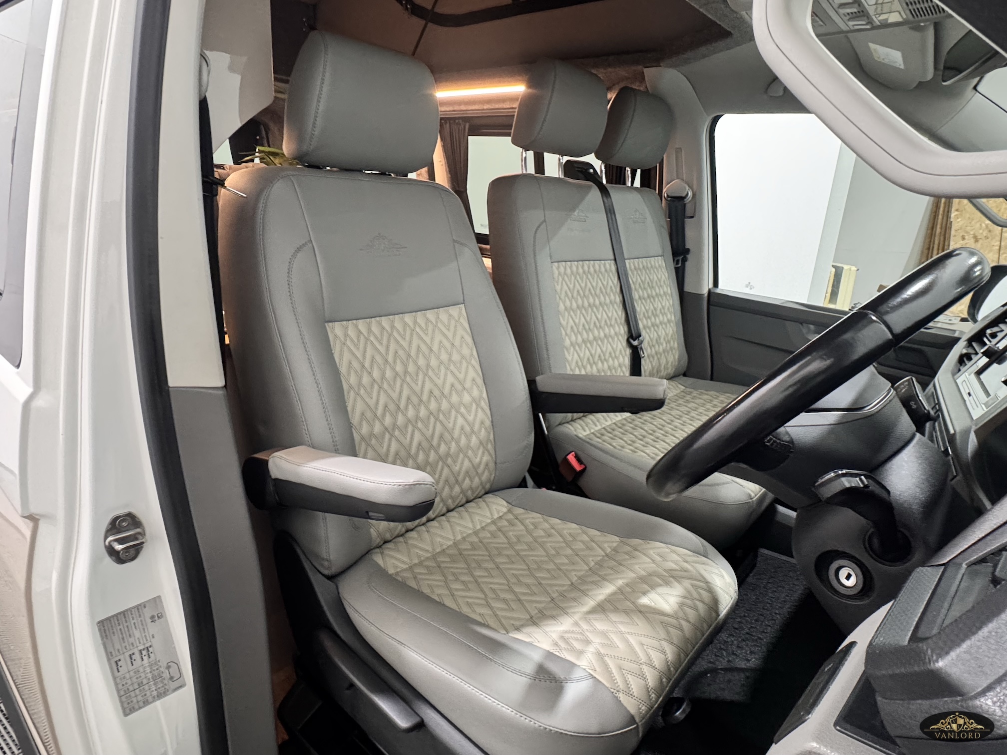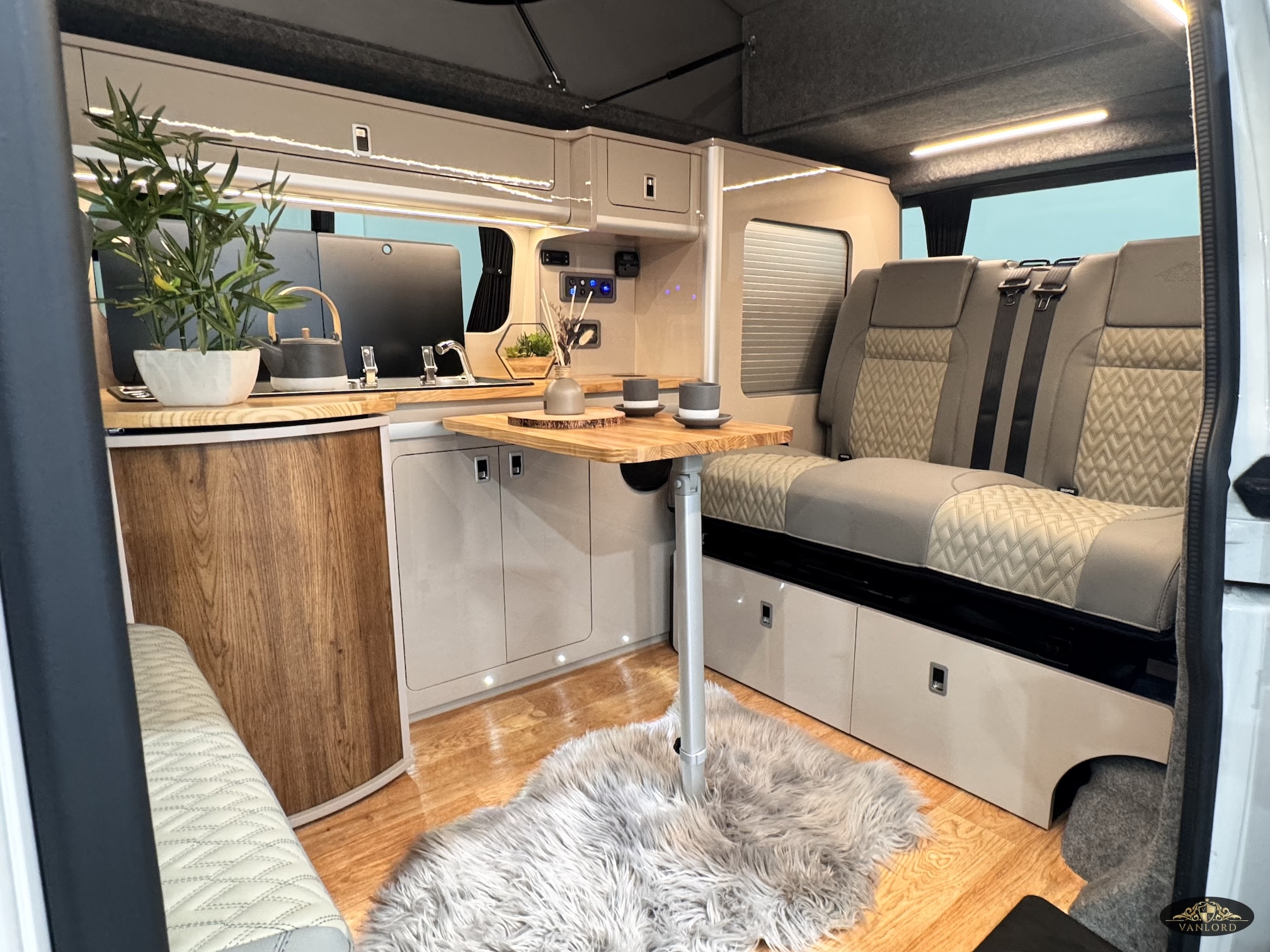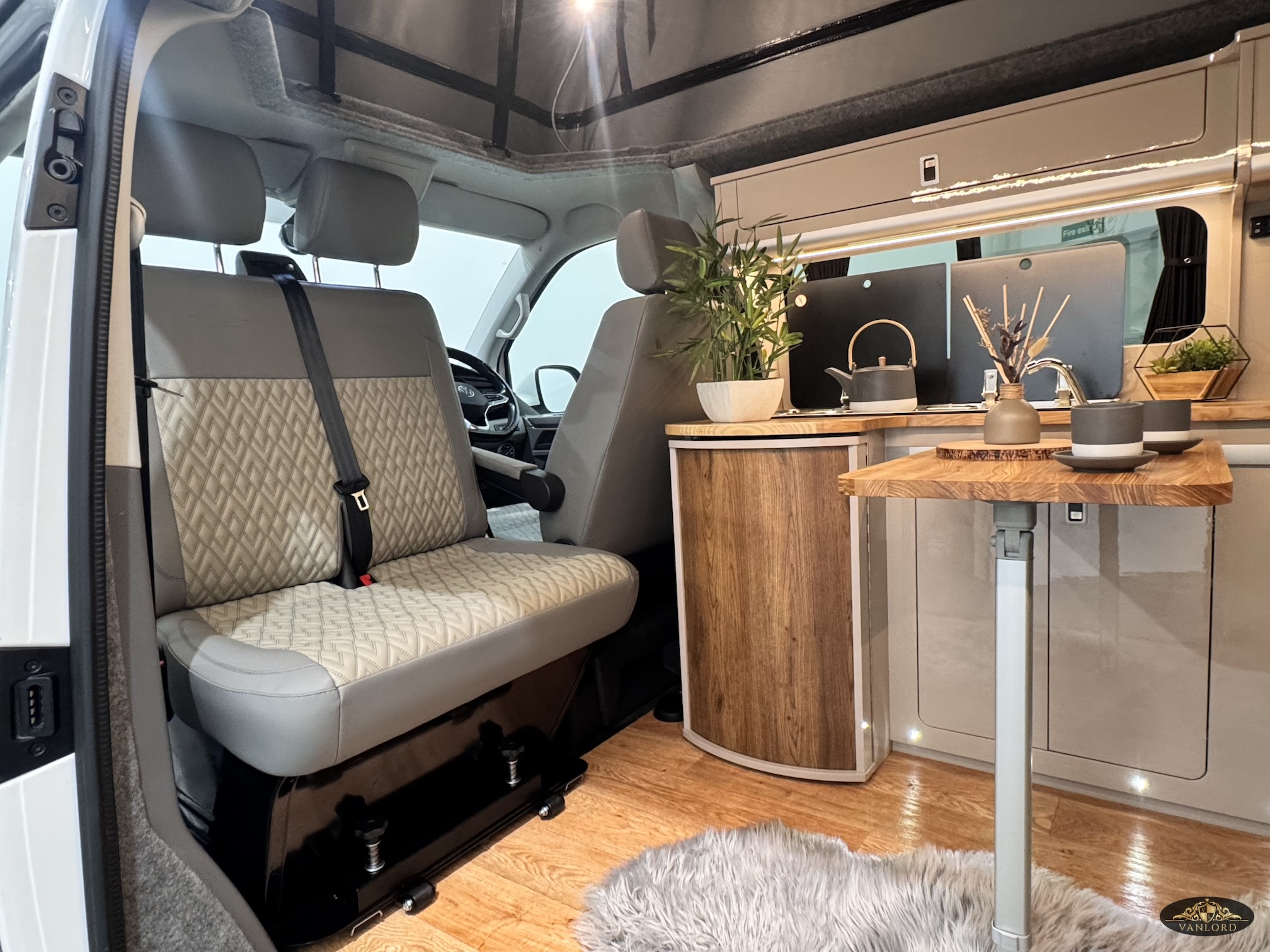 Our usual high-end conversion comes loaded with a front TUV approved passenger swivel base, RIB Altair 112cm Slider bed trimmed in Grey-Cream leatherette with two integrated ISOFIX points and two full size drawers, 50L fridge-freezer, double gas cooker, Eberspacher diesel heater, bespoke 12V electrical installation with integrated wireless charging pad much more.