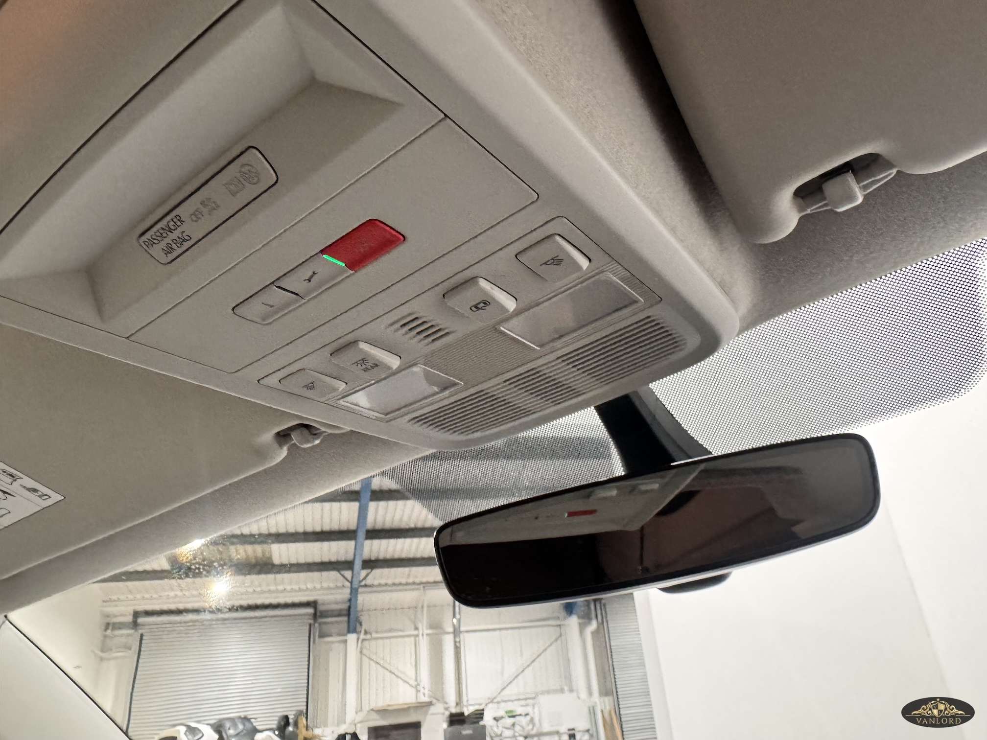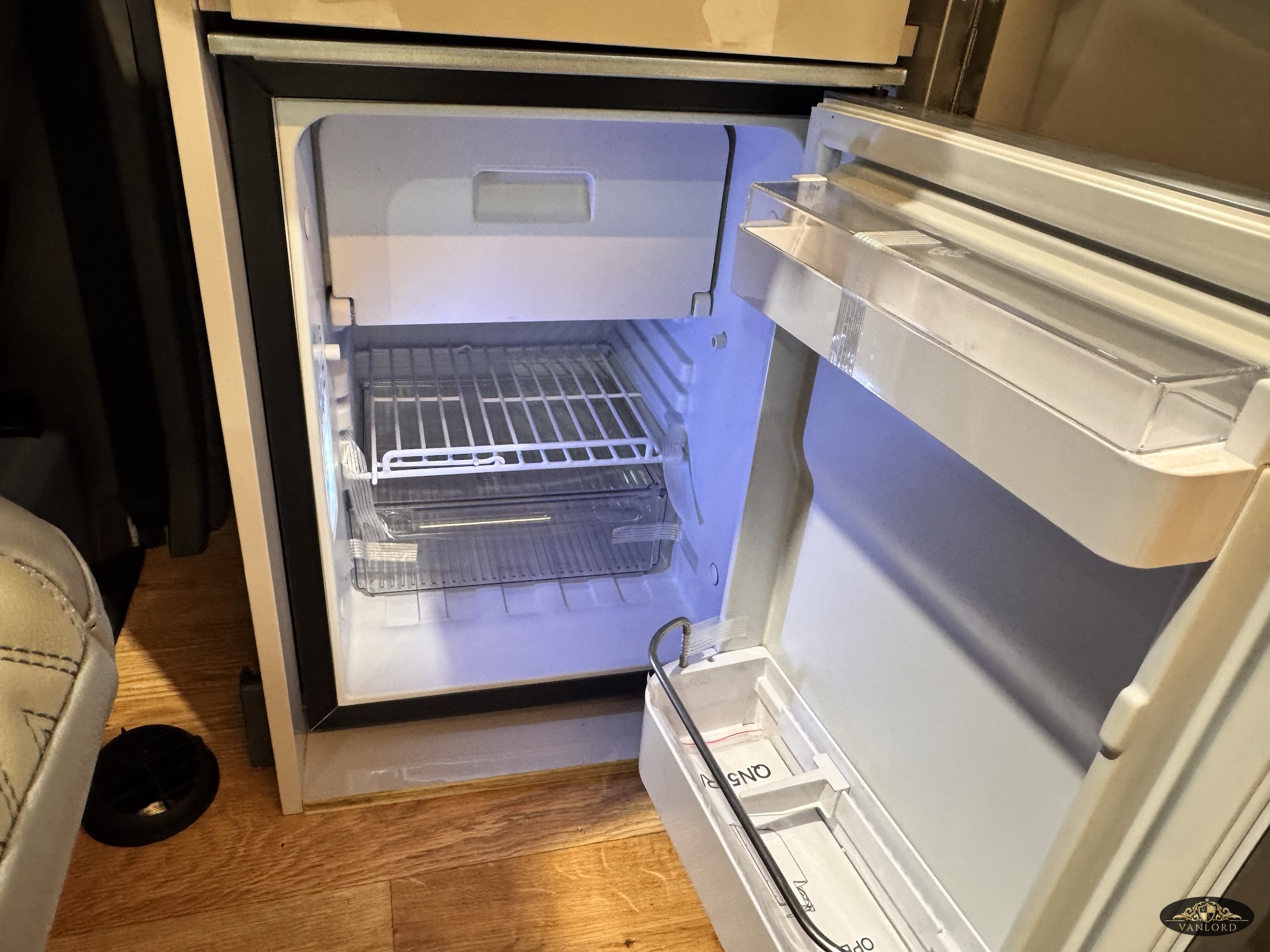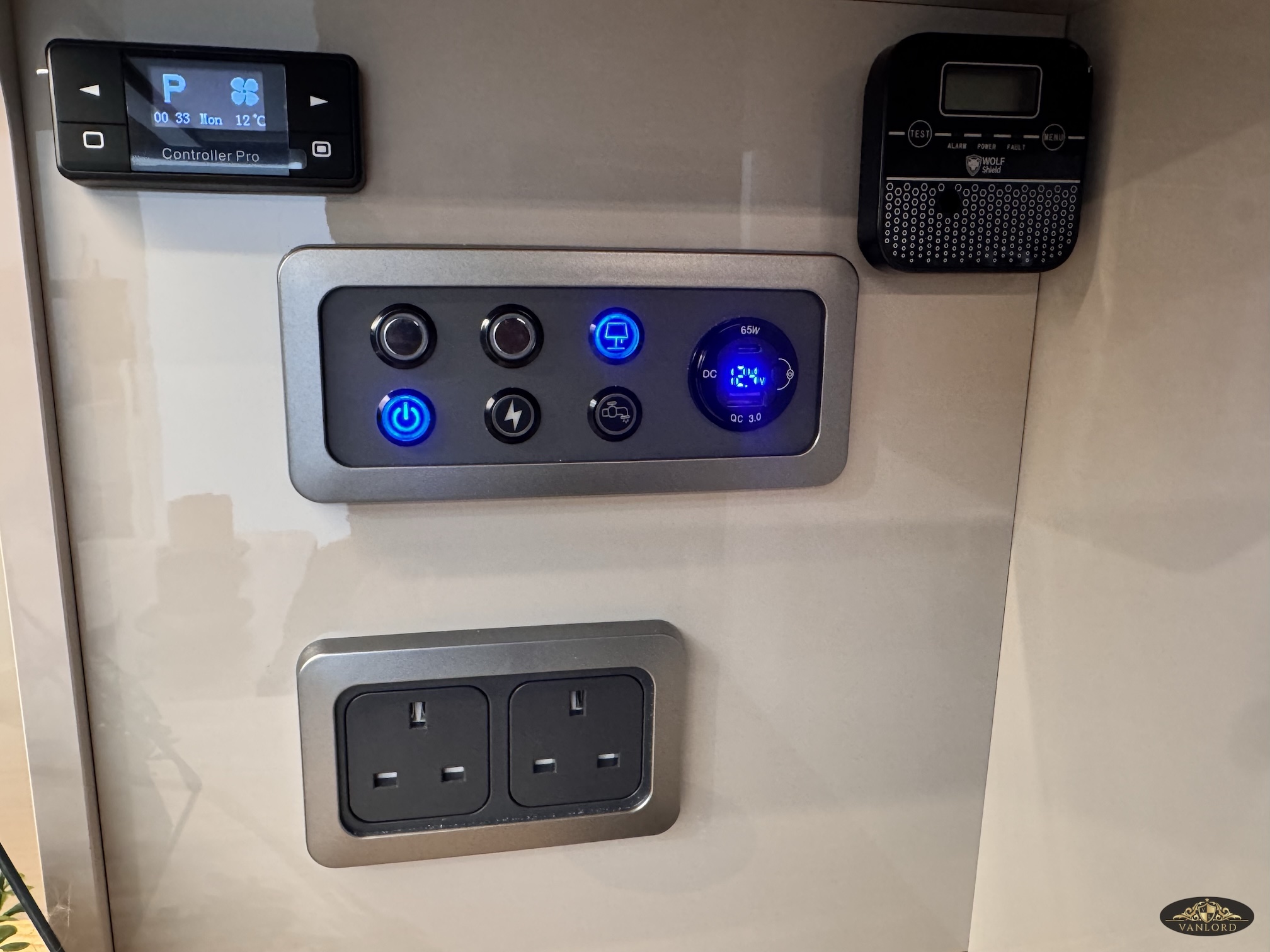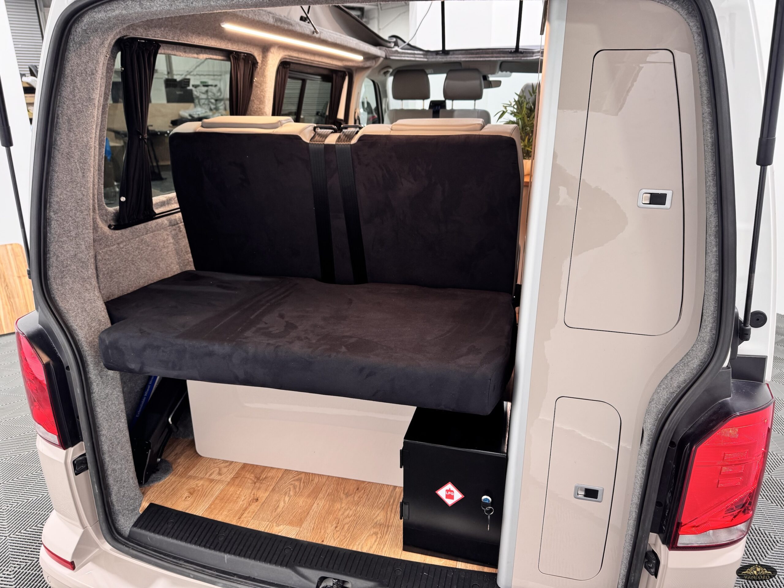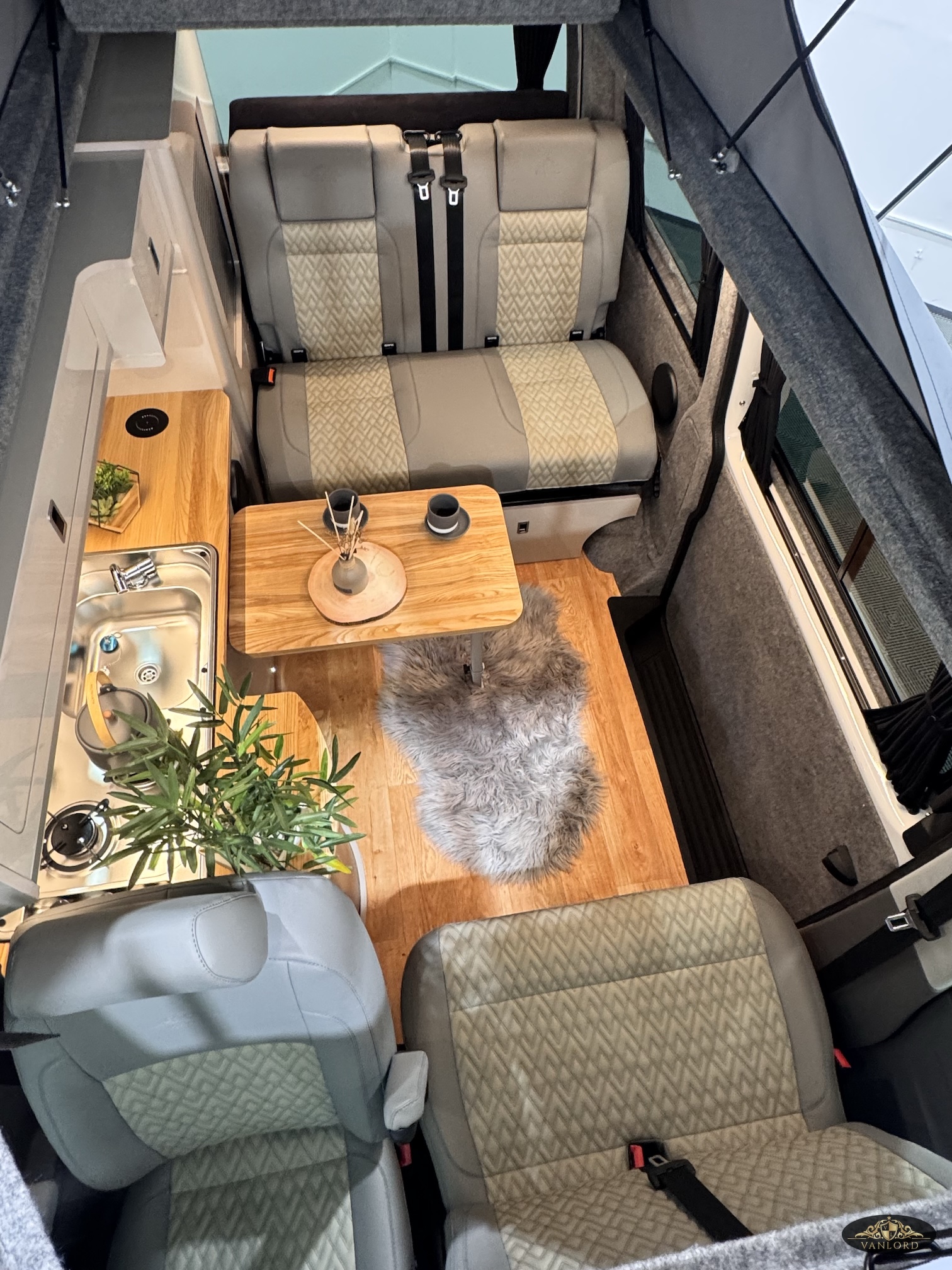 Our usual high-end conversion comes loaded with a front TUV approved passenger swivel base, RIB Altair 112cm Slider bed trimmed in Grey-Cream leatherette with two integrated ISOFIX points and two full size drawers, 50L fridge-freezer, double gas cooker, Eberspacher diesel heater, bespoke 12V electrical installation with integrated wireless charging pad much more.